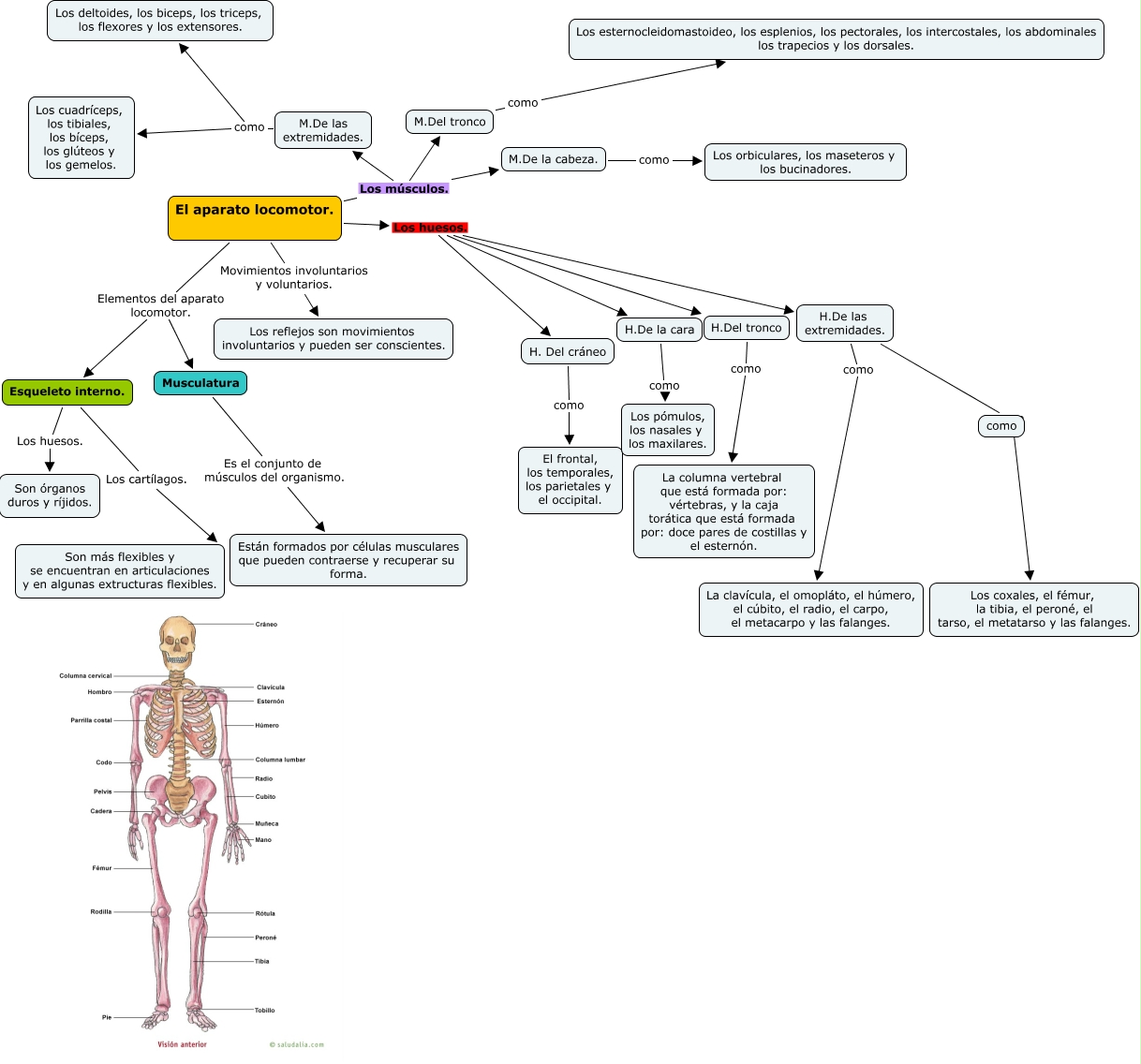 Este Cmap, tiene información relacionada con: aparato locomotor cono, El aparato locomotor. Los músculos. M.De las extremidades., H.De la cara como Los pómulos, los nasales y los maxilares., H.De las extremidades. ???? Los coxales, el fémur, la tibia, el peroné, el tarso, el metatarso y las falanges., H. Del cráneo como El frontal, los temporales, los parietales y el occipital., H.Del tronco como La columna vertebral que está formada por: vértebras, y la caja torática que está formada por: doce pares de costillas y el esternón., M.De las extremidades. como Los deltoides, los biceps, los triceps, los flexores y los extensores., Esqueleto interno. Los huesos. Son órganos duros y ríjidos., El aparato locomotor. Los huesos. H.De la cara, M.De la cabeza. como Los orbiculares, los maseteros y los bucinadores., M.De las extremidades. como Los cuadríceps, los tibiales, los bíceps, los glúteos y los gemelos., M.Del tronco como Los esternocleidomastoideo, los esplenios, los pectorales, los intercostales, los abdominales los trapecios y los dorsales., El aparato locomotor. Elementos del aparato locomotor. Musculatura, H.De las extremidades. como La clavícula, el omopláto, el húmero, el cúbito, el radio, el carpo, el metacarpo y las falanges., Musculatura Es el conjunto de músculos del organismo. Están formados por células musculares que pueden contraerse y recuperar su forma., El aparato locomotor. Los huesos. H.Del tronco, El aparato locomotor. Elementos del aparato locomotor. Esqueleto interno., El aparato locomotor. Movimientos involuntarios y voluntarios. Los reflejos son movimientos involuntarios y pueden ser conscientes., El aparato locomotor. Los músculos. M.Del tronco, Esqueleto interno. Los cartílagos. Son más flexibles y se encuentran en articulaciones y en algunas extructuras flexibles., El aparato locomotor. Los huesos. H.De las extremidades.