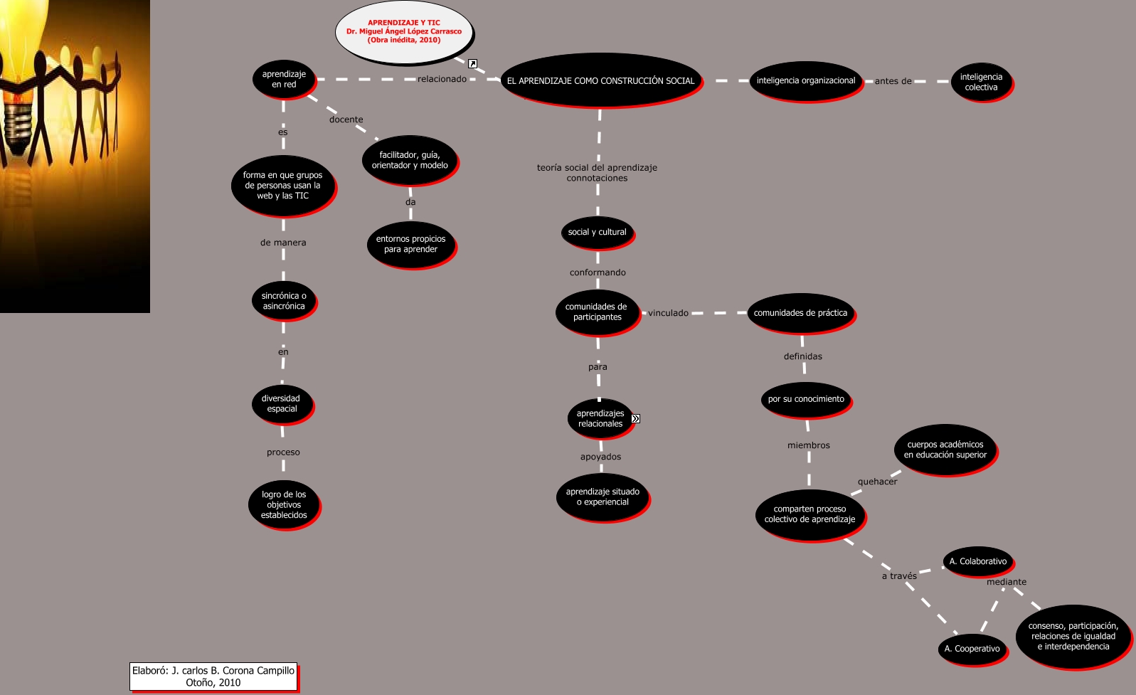 Este Cmap, tiene información relacionada con: Const. social, comunidades de participantes para devenir (identidad), EL APRENDIZAJE COMO CONSTRUCCIÓN SOCIAL relacionado aprendizaje en red, por su conocimiento miembros comparten proceso colectivo de aprendizaje, comunidades de participantes para experiencia (significado), aprendizajes relacionales apoyados aprendizaje situado o experiencial, diversidad espacial proceso logro de los objetivos establecidos, comunidades de participantes para filiación (comunidad), comparten proceso colectivo de aprendizaje a través A. Cooperativo, inteligencia organizacional antes de inteligencia colectiva, facilitador, guía, orientador y modelo da entornos propicios para aprender, sincrónica o asincrónica en diversidad espacial, A. Cooperativo mediante consenso, participación, relaciones de igualdad e interdependencia, comunidades de práctica definidas por su conocimiento, EL APRENDIZAJE COMO CONSTRUCCIÓN SOCIAL ???? inteligencia organizacional, social y cultural conformando comunidades de participantes, forma en que grupos de personas usan la web y las TIC de manera sincrónica o asincrónica, aprendizaje en red es forma en que grupos de personas usan la web y las TIC, EL APRENDIZAJE COMO CONSTRUCCIÓN SOCIAL teoría social del aprendizaje connotaciones social y cultural, comparten proceso colectivo de aprendizaje a través A. Colaborativo, APRENDIZAJE Y TIC Dr. Miguel Ángel López Carrasco (Obra inédita, 2010) ???? EL APRENDIZAJE COMO CONSTRUCCIÓN SOCIAL