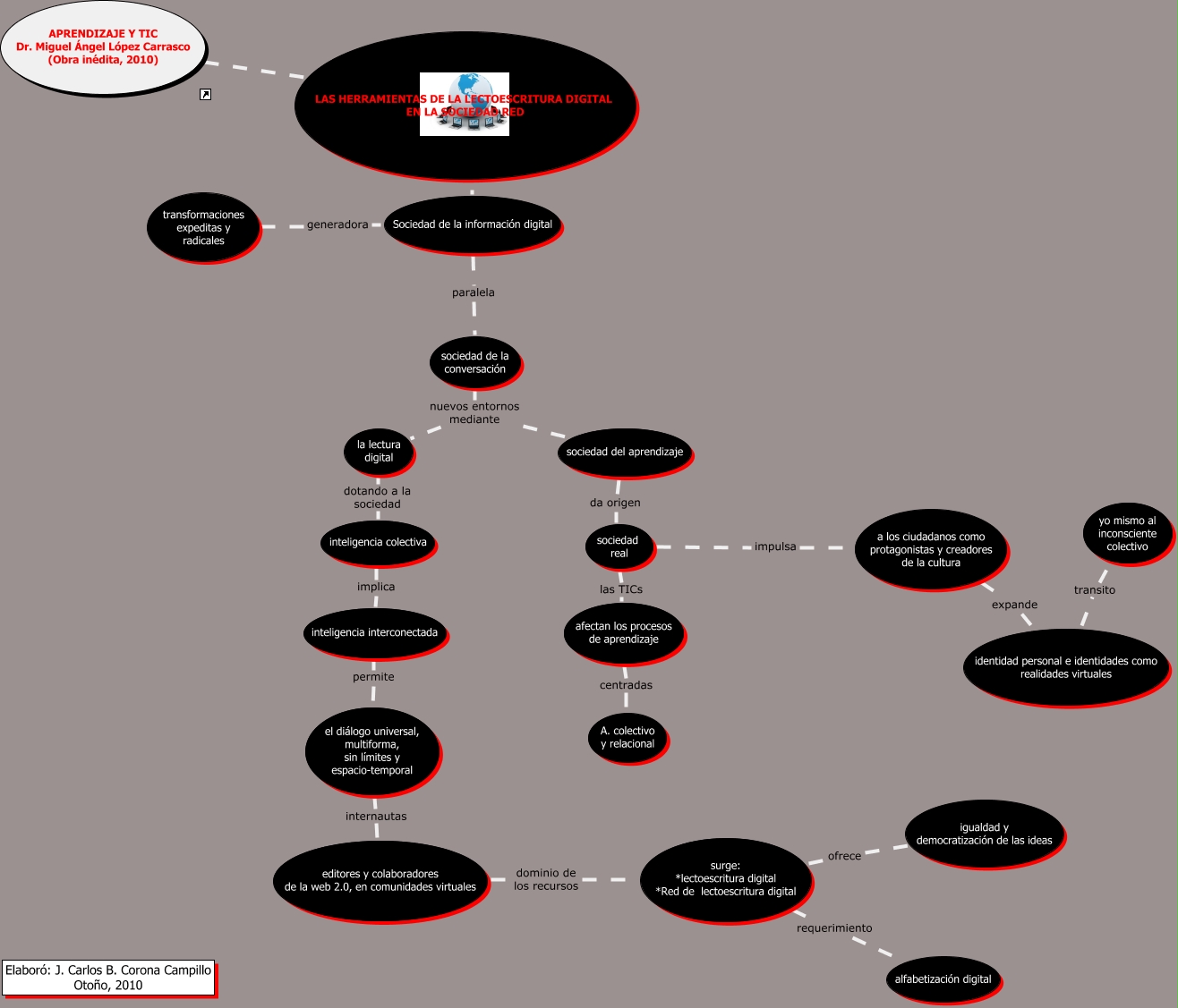 Este Cmap, tiene información relacionada con: lectoescritura digital, surge: *lectoescritura digital *Red de lectoescritura digital ofrece igualdad y democratización de las ideas, sociedad real impulsa a los ciudadanos como protagonistas y creadores de la cultura, el diálogo universal, multiforma, sin límites y espacio-temporal internautas editores y colaboradores de la web 2.0, en comunidades virtuales, APRENDIZAJE Y TIC Dr. Miguel Ángel López Carrasco (Obra inédita, 2010) ???? LAS HERRAMIENTAS DE LA LECTOESCRITURA DIGITAL EN LA SOCIEDAD RED, sociedad de la conversación nuevos entornos mediante sociedad del aprendizaje, la lectura digital dotando a la sociedad inteligencia colectiva, Sociedad de la información digital paralela sociedad de la conversación, LAS HERRAMIENTAS DE LA LECTOESCRITURA DIGITAL EN LA SOCIEDAD RED ???? Sociedad de la información digital, identidad personal e identidades como realidades virtuales transito yo mismo al inconsciente colectivo, inteligencia interconectada permite el diálogo universal, multiforma, sin límites y espacio-temporal, afectan los procesos de aprendizaje centradas A. colectivo y relacional, editores y colaboradores de la web 2.0, en comunidades virtuales dominio de los recursos surge: *lectoescritura digital *Red de lectoescritura digital, inteligencia colectiva implica inteligencia interconectada, sociedad de la conversación nuevos entornos mediante la lectura digital, surge: *lectoescritura digital *Red de lectoescritura digital requerimiento alfabetización digital, sociedad real las TICs afectan los procesos de aprendizaje, sociedad del aprendizaje da origen sociedad real, Sociedad de la información digital generadora transformaciones expeditas y radicales, a los ciudadanos como protagonistas y creadores de la cultura expande identidad personal e identidades como realidades virtuales