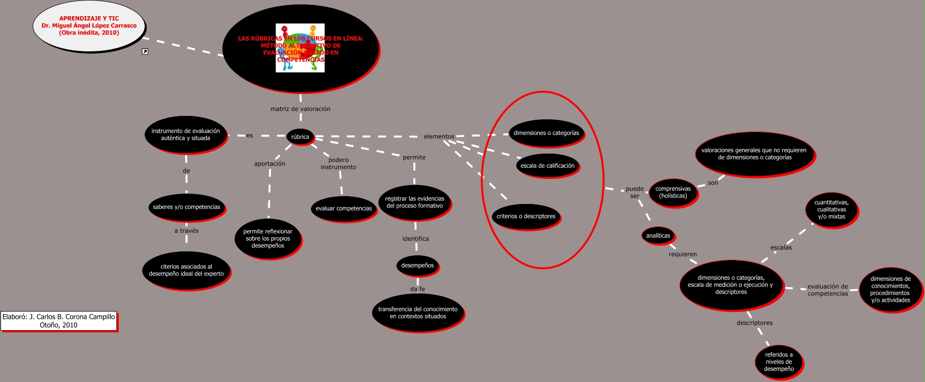 Este Cmap, tiene información relacionada con: rúbricas, rúbrica aportación permite reflexionar sobre los propios desempeños, registrar las evidencias del proceso formativo identifica desempeños, comprensivas (holísticas) son valoraciones generales que no requieren de dimensiones o categorías, instrumento de evaluación auténtica y situada de saberes y/o competencias, rúbrica es instrumento de evaluación auténtica y situada, rúbrica podero instrumento evaluar competencias, APRENDIZAJE Y TIC Dr. Miguel Ángel López Carrasco (Obra inédita, 2010) ???? LAS RÚBRICAS EN LOS CURSOS EN LÍNEA: MÉTODO ALTERNATIVO DE EVALUACIÓN BASADO EN COMPETENCIAS, rúbrica permite registrar las evidencias del proceso formativo, ???? puede ser comprensivas (holísticas), analíticas requieren dimensiones o categorías, escala de medición o ejecución y descriptores, dimensiones o categorías, escala de medición o ejecución y descriptores evaluación de competencias dimensiones de conocimientos, procedimientos y/o actividades, ???? puede ser analíticas, dimensiones o categorías, escala de medición o ejecución y descriptores descriptores referidos a niveles de desempeño, LAS RÚBRICAS EN LOS CURSOS EN LÍNEA: MÉTODO ALTERNATIVO DE EVALUACIÓN BASADO EN COMPETENCIAS matriz de valoración rúbrica, rúbrica elementos ????, rúbrica elementos dimensiones o categorías, saberes y/o competencias a través citerios asociados al desempeño ideal del experto, ???? ???? dimensiones o categorías, dimensiones o categorías, escala de medición o ejecución y descriptores escalas cuantitativas, cualitativas y/o mixtas, rúbrica elementos criterios o descriptores