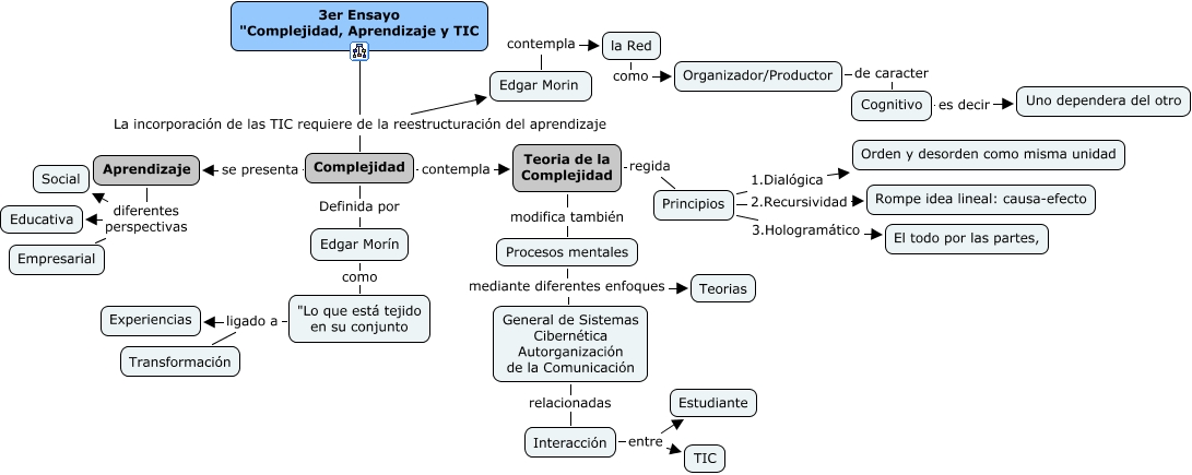 Este Cmap, tiene información relacionada con: 3. Complejidad, Aprendizaje y TIC, Organizador/Productor de caracter Cognitivo, Teoria de la Complejidad regida Principios, Edgar Morin contempla la Red, Procesos mentales mediante diferentes enfoques General de Sistemas Cibernética Autorganización de la Comunicación, Edgar Morín como "Lo que está tejido en su conjunto, Interacción entre Estudiante, Procesos mentales mediante diferentes enfoques Teorias, Aprendizaje diferentes perspectivas Social, Interacción entre TIC, "Lo que está tejido en su conjunto ligado a Experiencias, Complejidad contempla Teoria de la Complejidad, Complejidad se presenta Aprendizaje, Principios 2.Recursividad Rompe idea lineal: causa-efecto, la Red como Organizador/Productor, 3er Ensayo "Complejidad, Aprendizaje y TIC La incorporación de las TIC requiere de la reestructuración del aprendizaje Complejidad, General de Sistemas Cibernética Autorganización de la Comunicación relacionadas Interacción, Cognitivo es decir Uno dependera del otro, Teoria de la Complejidad modifica también Procesos mentales, Principios 1.Dialógica Orden y desorden como misma unidad, Complejidad Definida por Edgar Morín