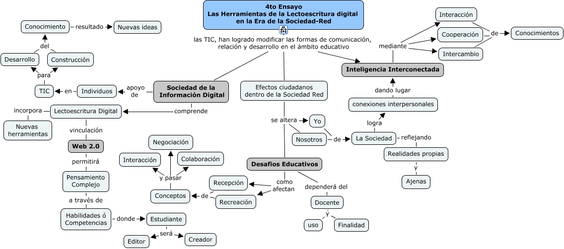 Este Cmap, tiene información relacionada con: 4. Las Herramientas de la Lectoescritura Digital en la Era de la Sociedad-Red, Inteligencia Interconectada mediante Interacción, Efectos ciudadanos dentro de la Sociedad Red se altera Desafios Educativos, Docente y uso, Recepción de Conceptos, Desafios Educativos como afectan Recepción, conexiones interpersonales dando lugar Inteligencia Interconectada, Realidades propias y Ajenas, Conceptos y pasar Colaboración, Intercambio de Conocimientos, Desafios Educativos dependerá del Docente, Recreación de Conceptos, Cooperación de Conocimientos, 4to Ensayo Las Herramientas de la Lectoescritura digital en la Era de la Sociedad-Red las TIC, han logrado modificar las formas de comunicación, relación y desarrollo en el ámbito educativo Inteligencia Interconectada, La Sociedad reflejando Realidades propias, Pensamiento Complejo a través de Habilidades ó Competencias, Habilidades ó Competencias donde Estudiante, 4to Ensayo Las Herramientas de la Lectoescritura digital en la Era de la Sociedad-Red las TIC, han logrado modificar las formas de comunicación, relación y desarrollo en el ámbito educativo Sociedad de la Información Digital, Lectoescritura Digital incorpora Nuevas herramientas, Construcción del Conocimiento, Web 2.0 permitirá Pensamiento Complejo