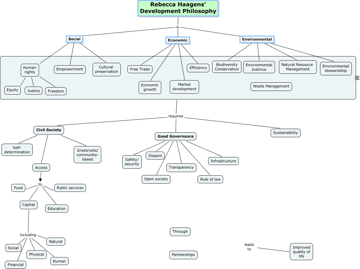 This Concept Map, created with IHMC CmapTools, has information related to: Rebecca Haagens Development Philosophy, Good Governance Dissent, Capital including Social, Economic Economic growth, Rebecca Haagens' Development Philosophy is Social, Capital including Physical, Environmental Environmental stewardship, Rebecca Haagens' Development Philosophy is Environmental, Environmental Biodiversity Conservation, Natural including Social, Social Cultural preservation, Social Human rights, Natural including Financial, Natural including Physical, Natural including Human, ???? requires Sustainability, Access to Public services, ???? requires Civil Society, Good Governance Rule of law, Good Governance Infrastructure, ???? requires Good Governance