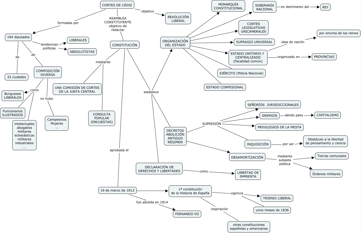 Este Cmap, tiene información relacionada con: cortesdecadiz, ORGANIZACIÓN DEL ESTADO ???? SUFRAGIO UNIVERSAL, COMPOSICIÓN DIVERSA como Burgueses LIBERALES, ORGANIZACIÓN DEL ESTADO ???? ESTADO UNITARIO Y CENTRALIZADO (fiscalidad común), 184 diputados tendencias políticas ABSOLUTISTAS, ESTADO UNITARIO Y CENTRALIZADO (fiscalidad común) organizado en PROVINCIAS, 184 diputados de 33 ciudades, DECRETOS ABOLICIÓN ANTIGUO RÉGIMEN ???? DESAMORTIZACIÓN, DECRETOS ABOLICIÓN ANTIGUO RÉGIMEN SUPRESIÓN INQUISICIÓN, CONSTITUCIÓN mediante UNA COMISIÓN DE CORTES DE LA JUNTA CENTRAL, DECRETOS ABOLICIÓN ANTIGUO RÉGIMEN SUPRESIÓN PRIVILEGIOS DE LA MESTA, CORTES DE CÁDIZ formadas por 184 diputados, CONSTITUCIÓN establece ORGANIZACIÓN DEL ESTADO, CORTES DE CÁDIZ ASAMBLEA CONSTITUYENTE objetivo de redactar CONSTITUCIÓN, CONSTITUCIÓN aprobada el 19 de marzo de 1812, COMPOSICIÓN DIVERSA no hubo Campesinos Mujeres ..., CONSTITUCIÓN establece DECRETOS ABOLICIÓN ANTIGUO RÉGIMEN, DECRETOS ABOLICIÓN ANTIGUO RÉGIMEN SUPRESIÓN GREMIOS, CONSTITUCIÓN establece DECLARACIÓN DE DERECHOS Y LIBERTADES, 19 de marzo de 1812 ???? 1ª constitución de la Historia de España, INQUISICIÓN por ser Obstáculo a la libertad de pensamiento y ciencia