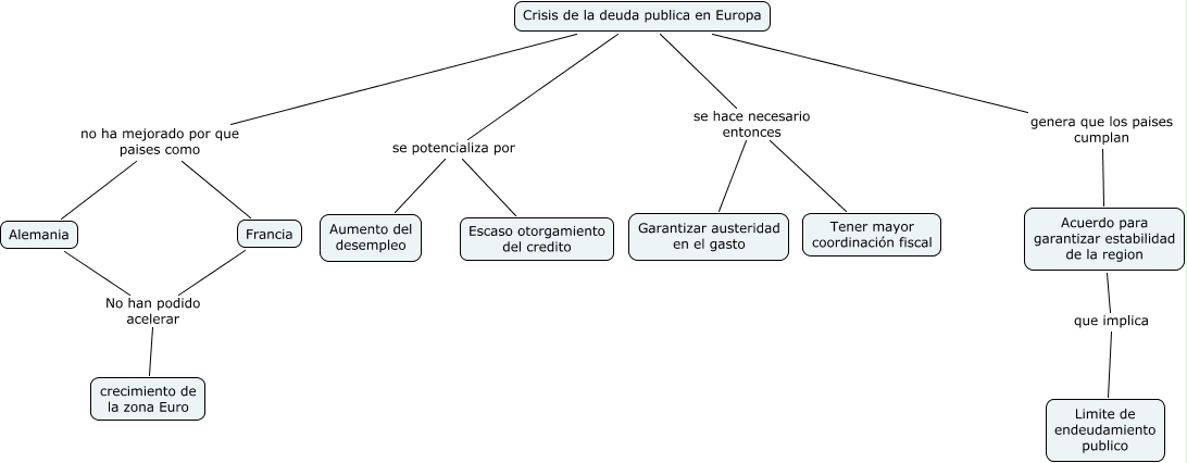 Este Cmap, tiene información relacionada con: Crisis de la deuda publica en Europa, Francia No han podido acelerar crecimiento de la zona Euro, Acuerdo para garantizar estabilidad de la region que implica Limite de endeudamiento publico, Crisis de la deuda publica en Europa no ha mejorado por que paises como Alemania, Crisis de la deuda publica en Europa se hace necesario entonces Tener mayor coordinación fiscal, Crisis de la deuda publica en Europa se potencializa por Aumento del desempleo, Crisis de la deuda publica en Europa se potencializa por Escaso otorgamiento del credito, Crisis de la deuda publica en Europa no ha mejorado por que paises como Francia, Alemania No han podido acelerar crecimiento de la zona Euro, Crisis de la deuda publica en Europa se hace necesario entonces Garantizar austeridad en el gasto, Crisis de la deuda publica en Europa genera que los paises cumplan Acuerdo para garantizar estabilidad de la region