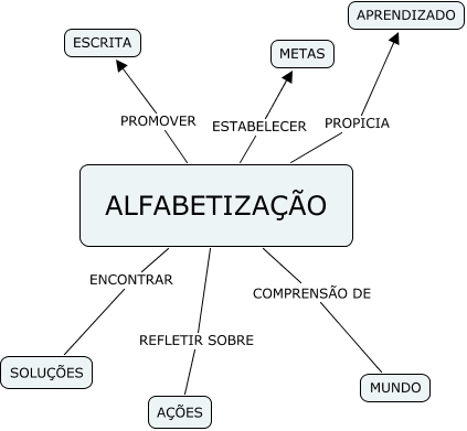 Esse mapa conceitual, produzido no IHMC CmapTools, tem a informação relacionada a: ALFABETIZAÇÃO, ALFABETIZAÇÃO COMPRENSÃO DE MUNDO, ALFABETIZAÇÃO ENCONTRAR SOLUÇÕES, ALFABETIZAÇÃO PROMOVER ESCRITA, ALFABETIZAÇÃO PROPICIA APRENDIZADO, ALFABETIZAÇÃO ESTABELECER METAS, ALFABETIZAÇÃO REFLETIR SOBRE AÇÕES