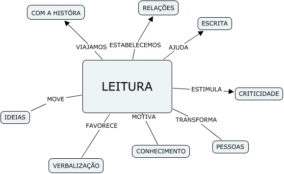Esse mapa conceitual, produzido no IHMC CmapTools, tem a informação relacionada a: LEITURA, LEITURA ESTABELECEMOS RELAÇÕES, LEITURA AJUDA ESCRITA, LEITURA MOTIVA CONHECIMENTO, LEITURA MOVE IDEIAS, LEITURA TRANSFORMA PESSOAS, LEITURA FAVORECE VERBALIZAÇÃO, LEITURA ESTIMULA CRITICIDADE, LEITURA VIAJAMOS COM A HISTÓRA