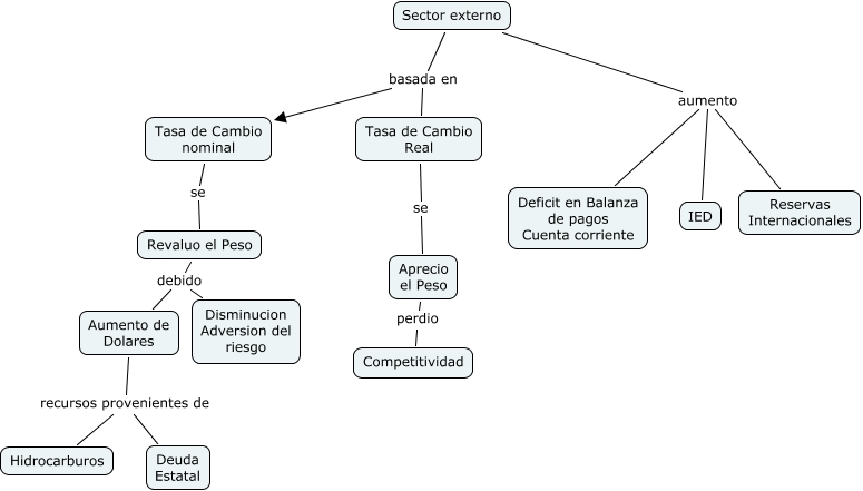 Este Cmap, tiene información relacionada con: Sector externo, Sector externo aumento IED, Aumento de Dolares recursos provenientes de Deuda Estatal, Sector externo basada en Tasa de Cambio Real, Aprecio el Peso perdio Competitividad, Aumento de Dolares recursos provenientes de Hidrocarburos, Sector externo aumento Reservas Internacionales, Tasa de Cambio Real se Aprecio el Peso, Sector externo basada en Tasa de Cambio nominal, Revaluo el Peso debido Disminucion Adversion del riesgo, Sector externo aumento Deficit en Balanza de pagos Cuenta corriente, Revaluo el Peso debido Aumento de Dolares, Tasa de Cambio nominal se Revaluo el Peso
