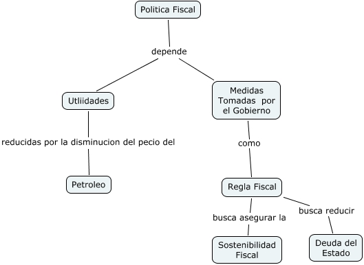 Este Cmap, tiene información relacionada con: Politica Fiscal, Medidas Tomadas por el Gobierno como Regla Fiscal, Regla Fiscal busca reducir Deuda del Estado, Politica Fiscal depende Utliidades, Utliidades reducidas por la disminucion del pecio del Petroleo, Politica Fiscal depende Medidas Tomadas por el Gobierno, Regla Fiscal busca asegurar la Sostenibilidad Fiscal