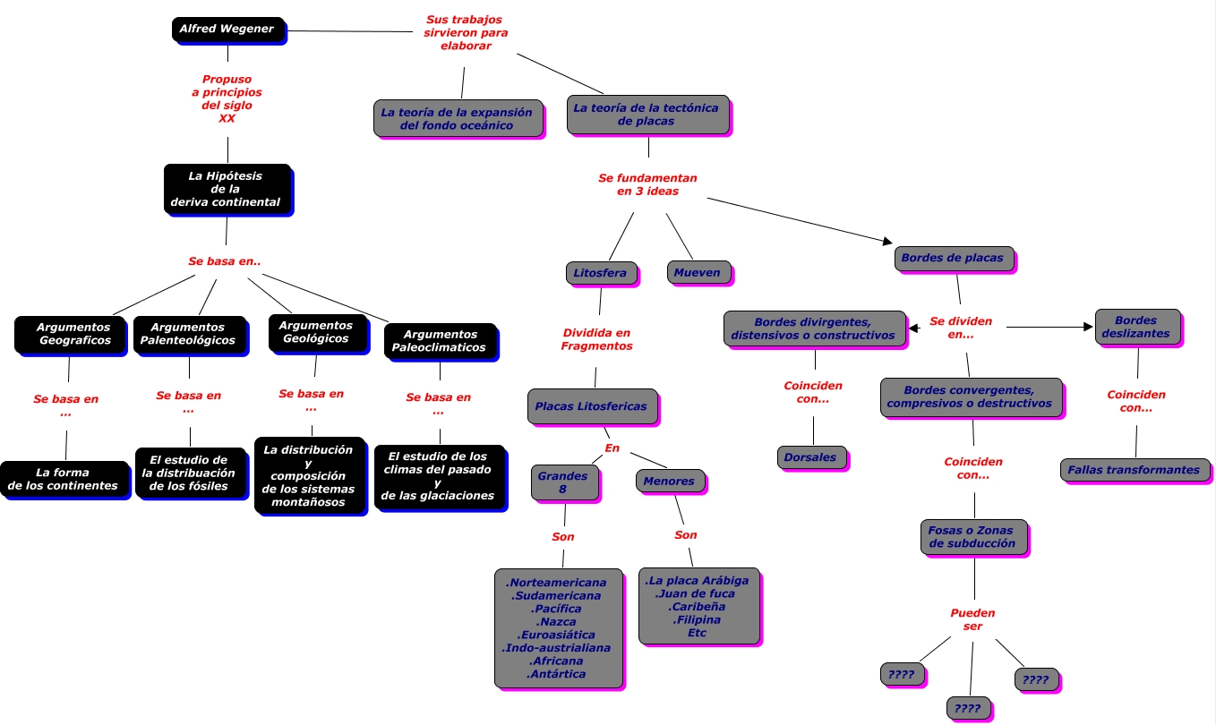 Este Cmap, tiene información relacionada con: Tectonicas-Juanjo 4º, Litosfera Dividida en Fragmentos Placas Litosfericas, La Hipótesis de la deriva continental Se basa en.. Argumentos Geológicos, Grandes 8 Son .Norteamericana .Sudamericana .Pacífica .Nazca .Euroasiática .Indo-austrialiana .Africana .Antártica, Argumentos Geológicos Se basa en ... La distribución y composición de los sistemas montañosos, Alfred Wegener Propuso a principios del siglo XX La Hipótesis de la deriva continental, La Hipótesis de la deriva continental Se basa en.. Argumentos Palenteológicos, Argumentos Palenteológicos Se basa en ... El estudio de la distribuación de los fósiles, Fosas o Zonas de subducción Pueden ser ????, Alfred Wegener Sus trabajos sirvieron para elaborar La teoría de la expansión del fondo oceánico, La Hipótesis de la deriva continental Se basa en.. Argumentos Paleoclimaticos, La teoría de la tectónica de placas Se fundamentan en 3 ideas Bordes de placas, Fosas o Zonas de subducción Pueden ser ????, Argumentos Paleoclimaticos Se basa en ... El estudio de los climas del pasado y de las glaciaciones, La Hipótesis de la deriva continental Se basa en.. Argumentos Geograficos, La teoría de la tectónica de placas Se fundamentan en 3 ideas Mueven, Placas Litosfericas En Grandes 8, Bordes deslizantes Coinciden con... Fallas transformantes, Bordes de placas Se dividen en... Bordes convergentes, compresivos o destructivos, Placas Litosfericas En Menores, Bordes convergentes, compresivos o destructivos Coinciden con... Fosas o Zonas de subducción