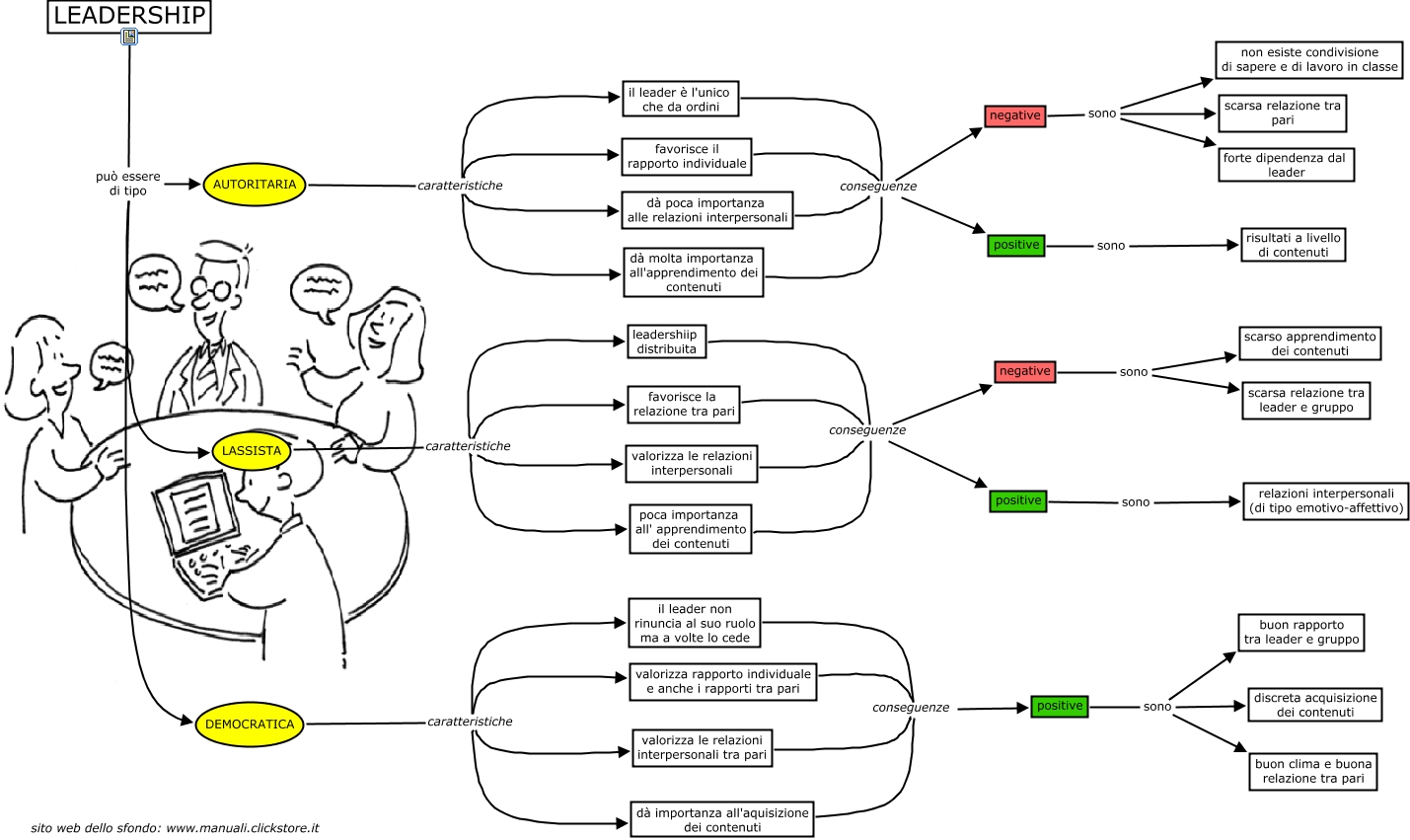 Questa Cmap, creata con IHMC CmapTools, contiene informazioni relative a: leadership 3, AUTORITARIA caratteristiche dà poca importanza alle relazioni interpersonali, LEADERSHIP può essere di tipo DEMOCRATICA, positive sono buon rapporto tra leader e gruppo, DEMOCRATICA caratteristiche il leader non rinuncia al suo ruolo ma a volte lo cede, positive sono risultati a livello di contenuti, favorisce la relazione tra pari conseguenze negative, positive sono discreta acquisizione dei contenuti, negative sono scarsa relazione tra leader e gruppo, LEADERSHIP può essere di tipo LASSISTA, valorizza rapporto individuale e anche i rapporti tra pari conseguenze positive, valorizza le relazioni interpersonali tra pari conseguenze positive, LASSISTA caratteristiche leadershiip distribuita, dà molta importanza all'apprendimento dei contenuti conseguenze negative, dà importanza all'aquisizione dei contenuti conseguenze positive, poca importanza all' apprendimento dei contenuti conseguenze positive, DEMOCRATICA caratteristiche valorizza rapporto individuale e anche i rapporti tra pari, il leader non rinuncia al suo ruolo ma a volte lo cede conseguenze positive, AUTORITARIA caratteristiche il leader è l'unico che da ordini, favorisce il rapporto individuale conseguenze negative, favorisce la relazione tra pari conseguenze positive