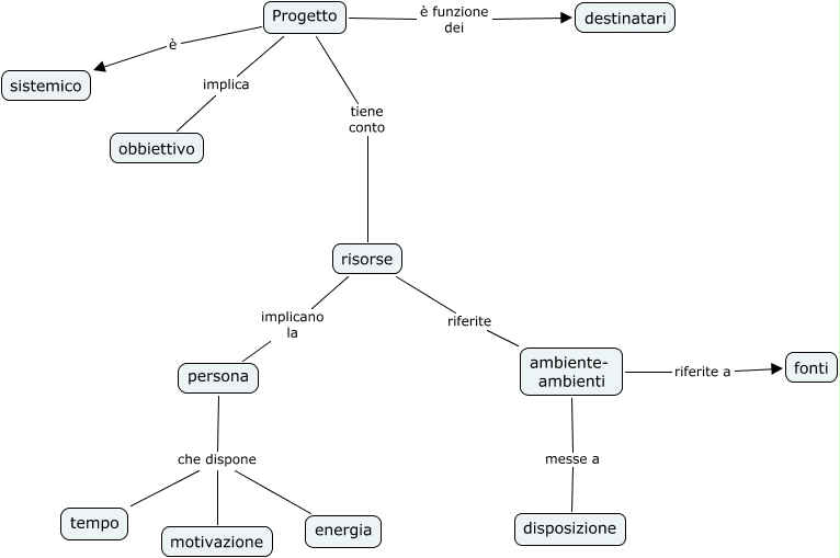 Questa Cmap, creata con IHMC CmapTools, contiene informazioni relative a: Progetto, Progetto tiene conto risorse, Progetto è funzione dei destinatari, persona che dispone motivazione, Progetto è sistemico, ambiente- ambienti riferite a fonti, persona che dispone tempo, persona che dispone energia, Progetto implica obbiettivo, risorse implicano la persona, ambiente- ambienti messe a disposizione, risorse riferite ambiente- ambienti