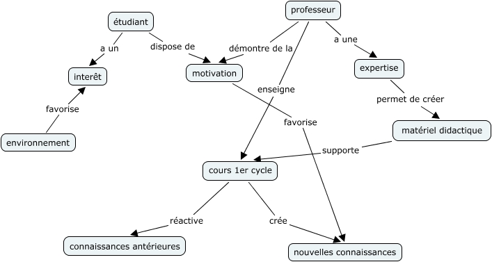 Cette carte de concepts créée avec IHMC CmapTools traite de: cours1ercycle, matériel didactique supporte cours 1er cycle, environnement favorise interêt, professeur a une expertise, étudiant a un interêt, motivation favorise nouvelles connaissances, étudiant dispose de motivation, professeur démontre de la motivation, expertise permet de créer matériel didactique, cours 1er cycle crée nouvelles connaissances, cours 1er cycle réactive connaissances antérieures, professeur enseigne cours 1er cycle