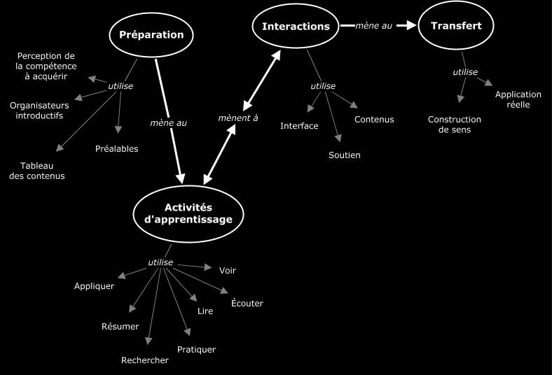 Cette carte de concepts créée avec IHMC CmapTools traite de: Apprentissage efficace en ligne, Préparation utilise Organisateurs introductifs, Interactions mènent à Activités d'apprentissage, Activités d'apprentissage utilise Rechercher, Interactions utilise Soutien, Activités d'apprentissage utilise Voir, Activités d'apprentissage utilise Écouter, Préparation mène au Activités d'apprentissage, Interactions utilise Contenus, Interactions mène au Transfert, Préparation utilise Préalables, Interactions utilise Interface, Préparation utilise Tableau des contenus, Préparation utilise Perception de la compétence à acquérir, Activités d'apprentissage utilise Lire, Activités d'apprentissage utilise Résumer, Transfert utilise Application réelle, Activités d'apprentissage utilise Appliquer, Transfert utilise Construction de sens, Activités d'apprentissage utilise Pratiquer