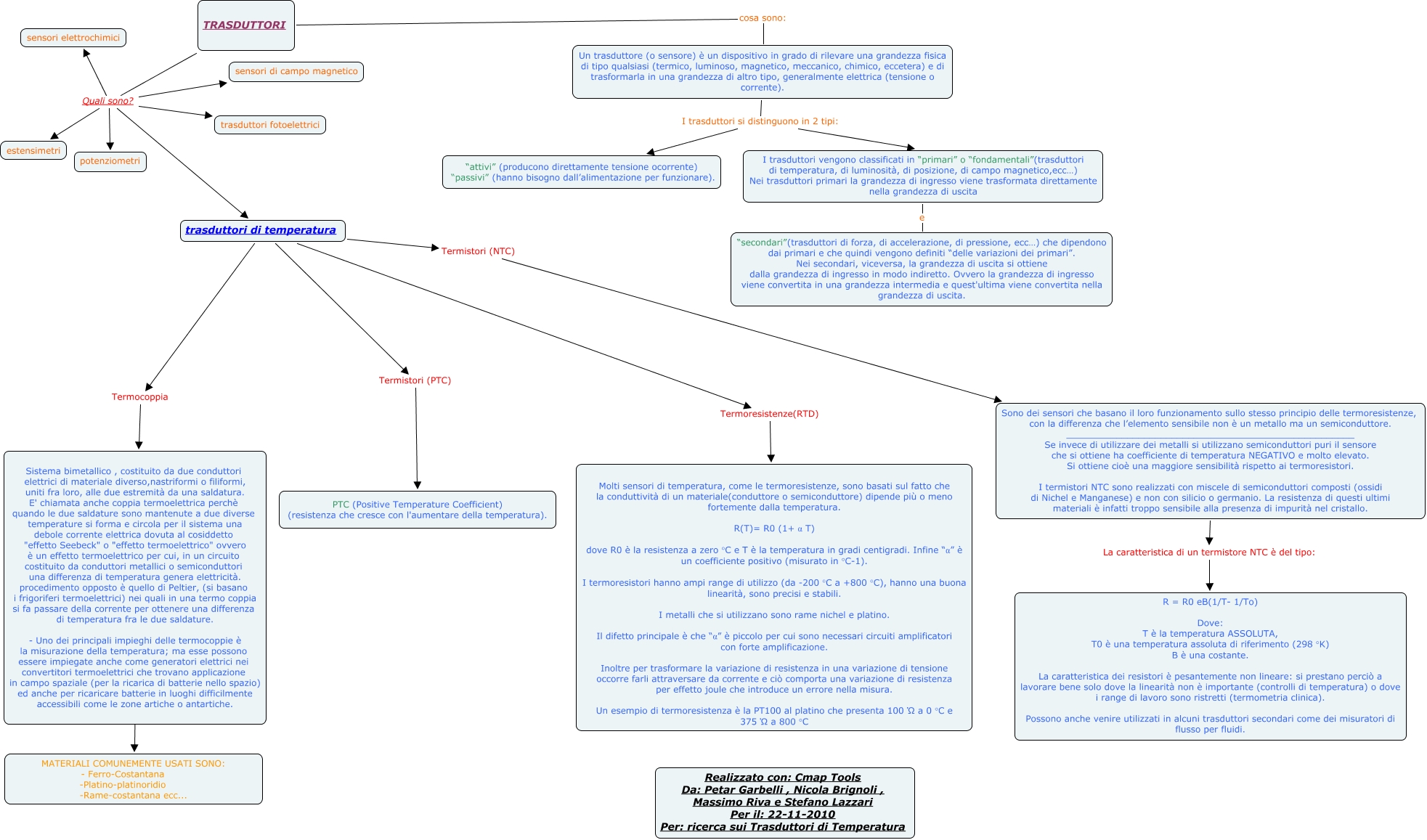 Questa Cmap, creata con IHMC CmapTools, contiene informazioni relative a: ricerca trasduttori nicola brignoli, TRASDUTTORI Quali sono? trasduttori di temperatura, TRASDUTTORI Quali sono? sensori di campo magnetico, TRASDUTTORI Quali sono? sensori elettrochimici, TRASDUTTORI Quali sono? estensimetri, TRASDUTTORI cosa sono: Un trasduttore (o sensore) è un dispositivo in grado di rilevare una grandezza fisica di tipo qualsiasi (termico, luminoso, magnetico, meccanico, chimico, eccetera) e di trasformarla in una grandezza di altro tipo, generalmente elettrica (tensione o corrente)., trasduttori di temperatura Termistori (PTC) PTC (Positive Temperature Coefficient) (resistenza che cresce con l'aumentare della temperatura)., trasduttori di temperatura Termistori (NTC) Sono dei sensori che basano il loro funzionamento sullo stesso principio delle termoresistenze, con la differenza che l’elemento sensibile non è un metallo ma un semiconduttore. ____________________________________________________ Se invece di utilizzare dei metalli si utilizzano semiconduttori puri il sensore che si ottiene ha coefficiente di temperatura NEGATIVO e molto elevato. Si ottiene cioè una maggiore sensibilità rispetto ai termoresistori. I termistori NTC sono realizzati con miscele di semiconduttori composti (ossidi di Nichel e Manganese) e non con silicio o germanio. La resistenza di questi ultimi materiali è infatti troppo sensibile alla presenza di impurità nel cristallo., TRASDUTTORI Quali sono? potenziometri, Un trasduttore (o sensore) è un dispositivo in grado di rilevare una grandezza fisica di tipo qualsiasi (termico, luminoso, magnetico, meccanico, chimico, eccetera) e di trasformarla in una grandezza di altro tipo, generalmente elettrica (tensione o corrente). I trasduttori si distinguono in 2 tipi: “attivi” (producono direttamente tensione ocorrente) “passivi” (hanno bisogno dall’alimentazione per funzionare)., trasduttori di temperatura Termoresistenze(RTD) Molti sensori di temperatura, come le termoresistenze, sono basati sul fatto che la conduttività di un materiale(conduttore o semiconduttore) dipende più o meno fortemente dalla temperatura. R(T)= R0 (1+ α T) dove R0 è la resistenza a zero °C e T è la temperatura in gradi centigradi. Infine “α” è un coefficiente positivo (misurato in °C-1). I termoresistori hanno ampi range di utilizzo (da -200 °C a +800 °C), hanno una buona linearità, sono precisi e stabili. I metalli che si utilizzano sono rame nichel e platino. Il difetto principale è che “α” è piccolo per cui sono necessari circuiti amplificatori con forte amplificazione. Inoltre per trasformare la variazione di resistenza in una variazione di tensione occorre farli attraversare da corrente e ciò comporta una variazione di resistenza per effetto joule che introduce un errore nella misura. Un esempio di termoresistenza è la PT100 al platino che presenta 100 Ώ a 0 °C e 375 Ώ a 800 °C, TRASDUTTORI Quali sono? trasduttori fotoelettrici, Sono dei sensori che basano il loro funzionamento sullo stesso principio delle termoresistenze, con la differenza che l’elemento sensibile non è un metallo ma un semiconduttore. ____________________________________________________ Se invece di utilizzare dei metalli si utilizzano semiconduttori puri il sensore che si ottiene ha coefficiente di temperatura NEGATIVO e molto elevato. Si ottiene cioè una maggiore sensibilità rispetto ai termoresistori. I termistori NTC sono realizzati con miscele di semiconduttori composti (ossidi di Nichel e Manganese) e non con silicio o germanio. La resistenza di questi ultimi materiali è infatti troppo sensibile alla presenza di impurità nel cristallo. La caratteristica di un termistore NTC è del tipo: R = R0 eB(1/T- 1/To) Dove: T è la temperatura ASSOLUTA, T0 è una temperatura assoluta di riferimento (298 °K) B è una costante. La caratteristica dei resistori è pesantemente non lineare: si prestano perciò a lavorare bene solo dove la linearità non è importante (controlli di temperatura) o dove i range di lavoro sono ristretti (termometria clinica). Possono anche venire utilizzati in alcuni trasduttori secondari come dei misuratori di flusso per fluidi., Un trasduttore (o sensore) è un dispositivo in grado di rilevare una grandezza fisica di tipo qualsiasi (termico, luminoso, magnetico, meccanico, chimico, eccetera) e di trasformarla in una grandezza di altro tipo, generalmente elettrica (tensione o corrente). I trasduttori si distinguono in 2 tipi: I trasduttori vengono classificati in “primari” o “fondamentali”(trasduttori di temperatura, di luminosità, di posizione, di campo magnetico,ecc…) Nei trasduttori primari la grandezza di ingresso viene trasformata direttamente nella grandezza di uscita, I trasduttori vengono classificati in “primari” o “fondamentali”(trasduttori di temperatura, di luminosità, di posizione, di campo magnetico,ecc…) Nei trasduttori primari la grandezza di ingresso viene trasformata direttamente nella grandezza di uscita e “secondari”(trasduttori di forza, di accelerazione, di pressione, ecc…) che dipendono dai primari e che quindi vengono definiti “delle variazioni dei primari”. Nei secondari, viceversa, la grandezza di uscita si ottiene dalla grandezza di ingresso in modo indiretto. Ovvero la grandezza di ingresso viene convertita in una grandezza intermedia e quest'ultima viene convertita nella grandezza di uscita., Sistema bimetallico , costituito da due conduttori elettrici di materiale diverso,nastriformi o filiformi, uniti fra loro, alle due estremità da una saldatura. E' chiamata anche coppia termoelettrica perchè quando le due saldature sono mantenute a due diverse temperature si forma e circola per il sistema una debole corrente elettrica dovuta al cosiddetto "effetto Seebeck" o "effetto termoelettrico" ovvero è un effetto termoelettrico per cui, in un circuito costituito da conduttori metallici o semicond