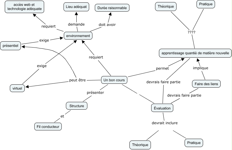 Cette carte de concepts créée avec IHMC CmapTools traite de: cours premier cycle, Un bon cours requiert environnement, virtuel exige environnement, Structure et Fil conducteur, environnement demande Lieu adéquat, Un bon cours peut être présentiel, Évaluation devrait inclure Théorique, Un bon cours peut être virtuel, Faire des liens implique apprentissage quantié de matière nouvelle, environnement requiert accès web et technologie adéquate, Évaluation devrait inclure Pratique, Faire des liens devrais faire partie Évaluation, environnement doit avoir Durée raisonnable, Un bon cours permet apprentissage quantié de matière nouvelle, Un bon cours Évaluation, Pratique ???? apprentissage quantié de matière nouvelle, Théorique ???? apprentissage quantié de matière nouvelle, présentiel exige environnement, apprentissage quantié de matière nouvelle devrais faire partie Évaluation, Un bon cours présenter Structure