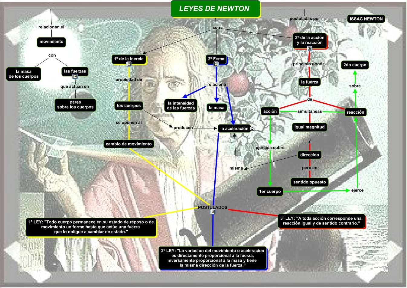 Este Cmap, tiene información relacionada con: Copia de LEYES DE NEWTON, los cuerpos se oponen al cambio de movimiento, 3º de la acción y la reacción principio donde la fuerza, la aceleración POSTULADOS 1º LEY: "Todo cuerpo permanece en su estado de reposo o de movimiento uniforme hasta que actúe una fuerza que lo obligue a cambiar de estado.", movimiento con la masa de los cuerpos, los cuerpos producen la aceleración, LEYES DE NEWTON relacionan el movimiento, 2º F=ma relaciona la masa, dirección pero en sentido opuesto, las fuerzas que actuan en pares sobre los cuerpos, LEYES DE NEWTON son 1º de la inercia, reacción sobre 2do cuerpo, 1º de la inercia propiedad de los cuerpos, LEYES DE NEWTON son 2º F=ma, dirección y igual magnitud, la fuerza de reacción, la fuerza de acción, 2º F=ma relaciona la intensidad de las fuerzas, la aceleración POSTULADOS 2º LEY: "La variación del movimiento o aceleracion es directamente proporcional a la fuerza, inversamente proporcional a la masa y tiene la misma dirección de la fuerza.", acción simultaneas reacción, a=f/m se expresa matematicamente