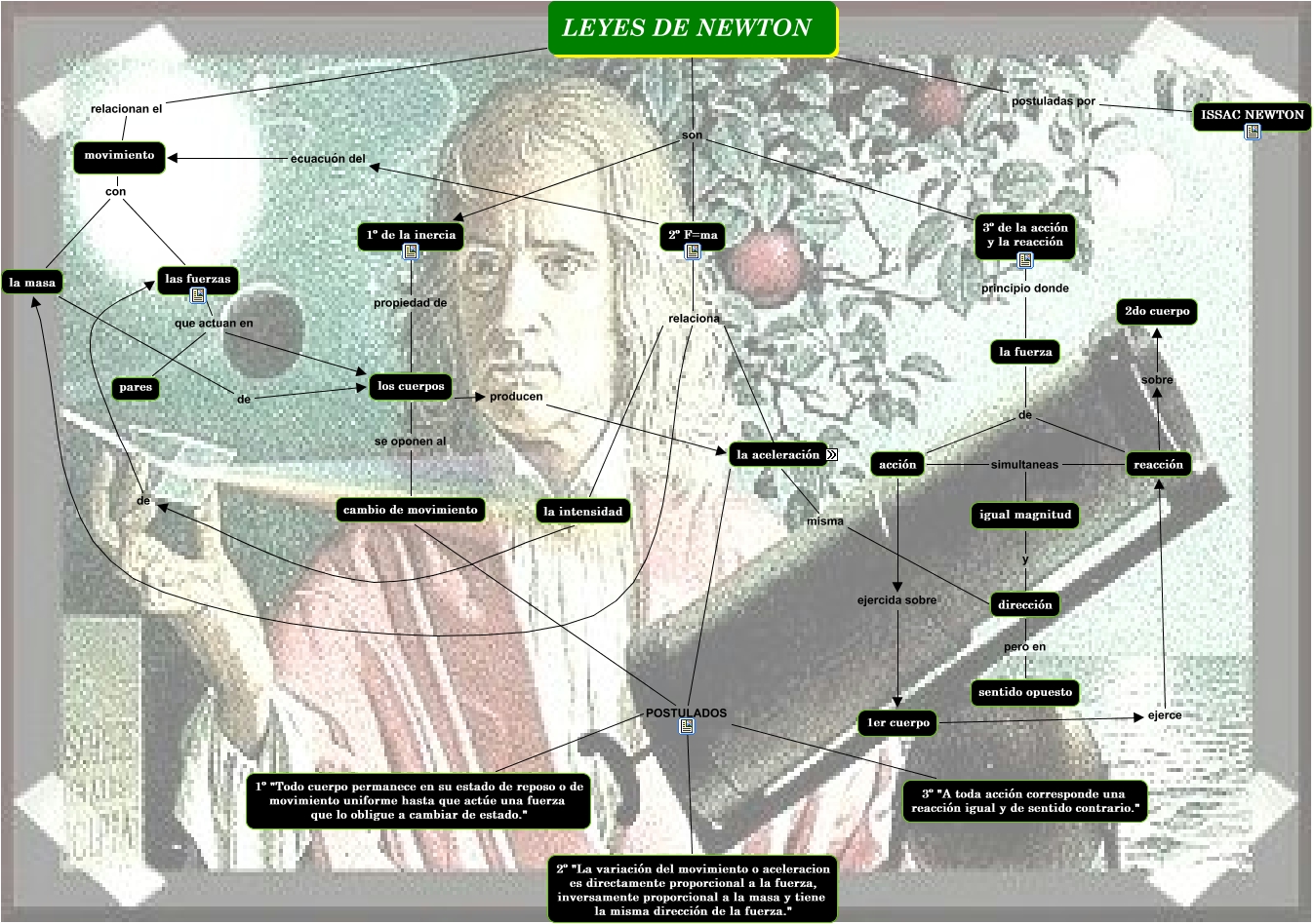 Este Cmap, tiene información relacionada con: LEYES DE NEWTON, los cuerpos producen la aceleración, las fuerzas que actuan en los cuerpos, la intensidad relaciona la masa, reacción sobre 2do cuerpo, dirección pero en sentido opuesto, 1er cuerpo ejerce reacción, 1º de la inercia propiedad de los cuerpos, 2º F=ma ecuacuón del movimiento, 2º F=ma relaciona la masa, la masa de los cuerpos, la aceleración POSTULADOS 1º "Todo cuerpo permanece en su estado de reposo o de movimiento uniforme hasta que actúe una fuerza que lo obligue a cambiar de estado.", a=f/m se expresa matematicamente, la fuerza de reacción, LEYES DE NEWTON son 3º de la acción y la reacción, LEYES DE NEWTON son 2º F=ma, la aceleración misma dirección, la aceleración POSTULADOS 2º "La variación del movimiento o aceleracion es directamente proporcional a la fuerza, inversamente proporcional a la masa y tiene la misma dirección de la fuerza.", la fuerza de acción, LEYES DE NEWTON relacionan el movimiento, la aceleración POSTULADOS 3º "A toda acción corresponde una reacción igual y de sentido contrario."