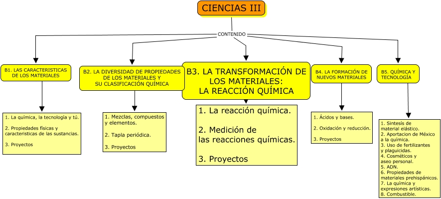 Este Cmap, tiene información relacionada con: Modificar.Contenido, B5. QUÍMICA Y TECNOLOGÍA ???? 1. Sintesís de material elástico. 2. Aportacion de México a la química. 3. Uso de fertilizantes y plaguicidas. 4. Cosméticos y aseo personal. 5. ADN. 6. Propiedades de materiales prehispánicos. 7. La química y expresiones artísticas. 8. Combustible., CIENCIAS III CONTENIDO B1. LAS CARACTERISTICAS DE LOS MATERIALES, B3. LA TRANSFORMACIÓN DE LOS MATERIALES: LA REACCIÓN QUÍMICA ???? 1. La reacción química. 2. Medición de las reacciones químicas. 3. Proyectos, B4. LA FORMACIÓN DE NUEVOS MATERIALES ???? 1. Ácidos y bases. 2. Oxidación y reducción. 3. Proyectos, B1. LAS CARACTERISTICAS DE LOS MATERIALES ???? 1. La química, la tecnología y tú. 2. Propiedades físicas y caracteristicas de las sustancias. 3. Proyectos, CIENCIAS III CONTENIDO B2. LA DIVERSIDAD DE PROPIEDADES DE LOS MATERIALES Y SU CLASIFICACIÓN QUÍMICA, B2. LA DIVERSIDAD DE PROPIEDADES DE LOS MATERIALES Y SU CLASIFICACIÓN QUÍMICA ???? 1. Mezclas, compuestos y elementos. 2. Tapla periódica. 3. Proyectos, CIENCIAS III CONTENIDO B5. QUÍMICA Y TECNOLOGÍA, CIENCIAS III CONTENIDO B4. LA FORMACIÓN DE NUEVOS MATERIALES, CIENCIAS III CONTENIDO B3. LA TRANSFORMACIÓN DE LOS MATERIALES: LA REACCIÓN QUÍMICA