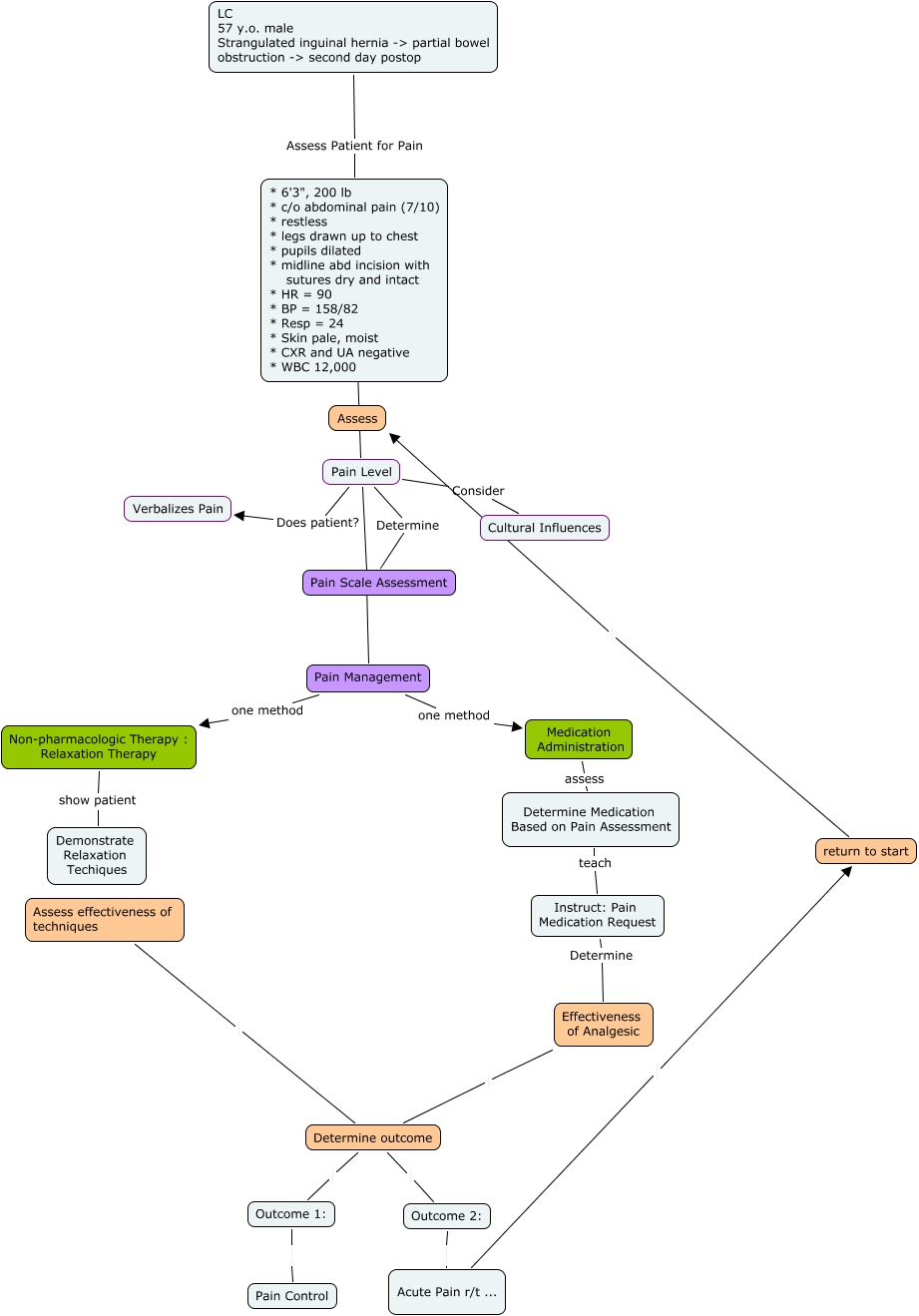 This Concept Map, created with IHMC CmapTools, has information related to: AcutePain, Barney, Pain Level ???? Pain Management, Pain Level Determine Pain Scale Assessment, Outcome 1: Pain Control, Acute Pain r/t ... return to start, Medication Administration assess Determine Medication Based on Pain Assessment, Pain Management one method Medication Administration, Determine outcome Outcome 2:, Effectiveness of Analgesic Determine outcome, Pain Level ???? * 6'3", 200 lb * c/o abdominal pain (7/10) * restless * legs drawn up to chest * pupils dilated * midline abd incision with sutures dry and intact * HR = 90 * BP = 158/82 * Resp = 24 * Skin pale, moist * CXR and UA negative * WBC 12,000, Pain Level Consider Cultural Influences, Determine outcome Outcome 1:, Non-pharmacologic Therapy : Relaxation Therapy show patient Demonstrate Relaxation Techiques, Pain Management one method Non-pharmacologic Therapy : Relaxation Therapy, Assess effectiveness of techniques Determine outcome, Outcome 2: Acute Pain r/t ..., Instruct: Pain Medication Request Determine Effectiveness of Analgesic, Pain Level Does patient? Verbalizes Pain, LC 57 y.o. male Strangulated inguinal hernia -> partial bowel obstruction -> second day postop Assess Patient for Pain * 6'3", 200 lb * c/o abdominal pain (7/10) * restless * legs drawn up to chest * pupils dilated * midline abd incision with sutures dry and intact * HR = 90 * BP = 158/82 * Resp = 24 * Skin pale, moist * CXR and UA negative * WBC 12,000, Determine Medication Based on Pain Assessment teach Instruct: Pain Medication Request, return to start Assess