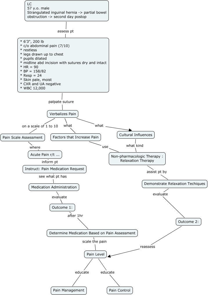 This Concept Map, created with IHMC CmapTools, has information related to: AcutePainALI - Parking Lot, Instruct: Pain Medication Request see what pt has Medication Administration, Verbalizes Pain what Factors that Increase Pain, Cultural Influences what kind Non-pharmacologic Therapy : Relaxation Therapy, Factors that Increase Pain use Non-pharmacologic Therapy : Relaxation Therapy, Determine Medication Based on Pain Assessment scale the pain Pain Level, LC 57 y.o. male Strangulated inguinal hernia -> partial bowel obstruction -> second day postop assess pt * 6'3", 200 lb * c/o abdominal pain (7/10) * restless * legs drawn up to chest * pupils dilated * midline abd incision with sutures dry and intact * HR = 90 * BP = 158/82 * Resp = 24 * Skin pale, moist * CXR and UA negative * WBC 12,000, Acute Pain r/t ... inform pt Instruct: Pain Medication Request, Medication Administration evaluate Outcome 1:, Pain Scale Assessment where Acute Pain r/t ..., * 6'3", 200 lb * c/o abdominal pain (7/10) * restless * legs drawn up to chest * pupils dilated * midline abd incision with sutures dry and intact * HR = 90 * BP = 158/82 * Resp = 24 * Skin pale, moist * CXR and UA negative * WBC 12,000 palpate suture Verbalizes Pain, Non-pharmacologic Therapy : Relaxation Therapy assist pt by Demonstrate Relaxation Techiques, Outcome 1: after 1hr Determine Medication Based on Pain Assessment, Outcome 2: reassess Pain Level, Verbalizes Pain what Cultural Influences, Verbalizes Pain on a scale of 1 to 10 Pain Scale Assessment, Pain Level educate Pain Control, Pain Level educate Pain Management, Demonstrate Relaxation Techiques evaluate Outcome 2: