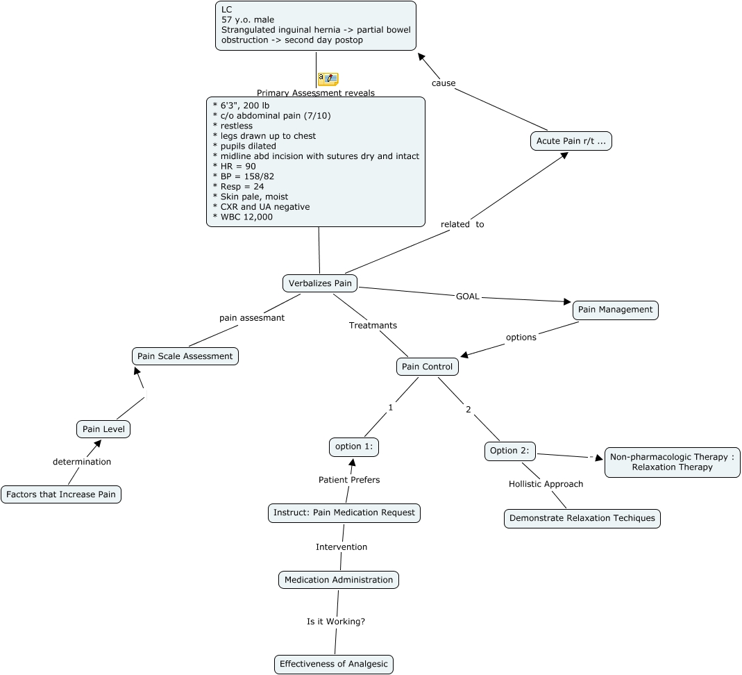 This Concept Map, created with IHMC CmapTools, has information related to: AcutePain - Aguilar, Pain Level Pain Scale Assessment, Factors that Increase Pain determination Pain Level, Pain Control 1 option 1:, Pain Management options Pain Control, Verbalizes Pain Treatmants Pain Control, Medication Administration Is it Working? Effectiveness of Analgesic, Option 2: Hollistic Approach Demonstrate Relaxation Techiques, Acute Pain r/t ... cause LC 57 y.o. male Strangulated inguinal hernia -> partial bowel obstruction -> second day postop, Verbalizes Pain GOAL Pain Management, Verbalizes Pain related to Acute Pain r/t ..., Pain Control 2 Option 2:, Option 2: . Non-pharmacologic Therapy : Relaxation Therapy, Instruct: Pain Medication Request Patient Prefers option 1:, LC 57 y.o. male Strangulated inguinal hernia -> partial bowel obstruction -> second day postop Primary Assessment reveals Verbalizes Pain, LC 57 y.o. male Strangulated inguinal hernia -> partial bowel obstruction -> second day postop Primary Assessment reveals * 6'3", 200 lb * c/o abdominal pain (7/10) * restless * legs drawn up to chest * pupils dilated * midline abd incision with sutures dry and intact * HR = 90 * BP = 158/82 * Resp = 24 * Skin pale, moist * CXR and UA negative * WBC 12,000, Instruct: Pain Medication Request Intervention Medication Administration, Verbalizes Pain pain assesmant Pain Scale Assessment