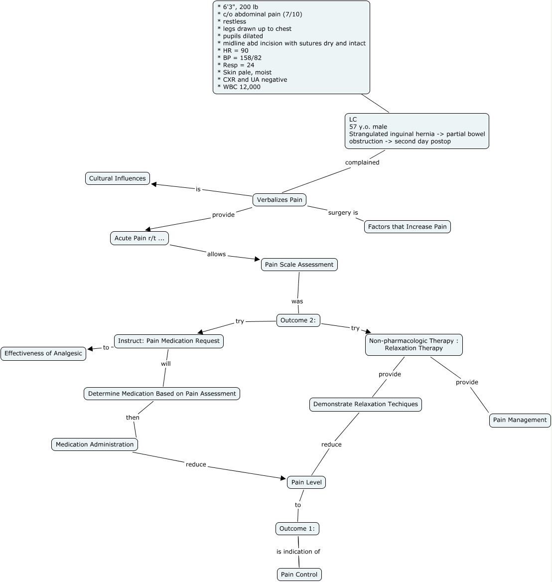 This Concept Map, created with IHMC CmapTools, has information related to: acutecare_Hutton, Verbalizes Pain surgery is Factors that Increase Pain, Demonstrate Relaxation Techiques reduce Pain Level, Outcome 2: try Instruct: Pain Medication Request, Outcome 2: try Non-pharmacologic Therapy : Relaxation Therapy, Verbalizes Pain is Cultural Influences, Medication Administration reduce Pain Level, Non-pharmacologic Therapy : Relaxation Therapy provide Demonstrate Relaxation Techiques, Instruct: Pain Medication Request will Determine Medication Based on Pain Assessment, Outcome 1: Pain Control, Non-pharmacologic Therapy : Relaxation Therapy provide Pain Management, Outcome 1: is indication of Pain Control, Instruct: Pain Medication Request to Effectiveness of Analgesic, LC 57 y.o. male Strangulated inguinal hernia -> partial bowel obstruction -> second day postop complained Verbalizes Pain, Verbalizes Pain provide Acute Pain r/t ..., Acute Pain r/t ... allows Pain Scale Assessment, Pain Scale Assessment was Outcome 2:, Determine Medication Based on Pain Assessment then Medication Administration, Pain Level to Outcome 1:, LC 57 y.o. male Strangulated inguinal hernia -> partial bowel obstruction -> second day postop ???? * 6'3", 200 lb * c/o abdominal pain (7/10) * restless * legs drawn up to chest * pupils dilated * midline abd incision with sutures dry and intact * HR = 90 * BP = 158/82 * Resp = 24 * Skin pale, moist * CXR and UA negative * WBC 12,000