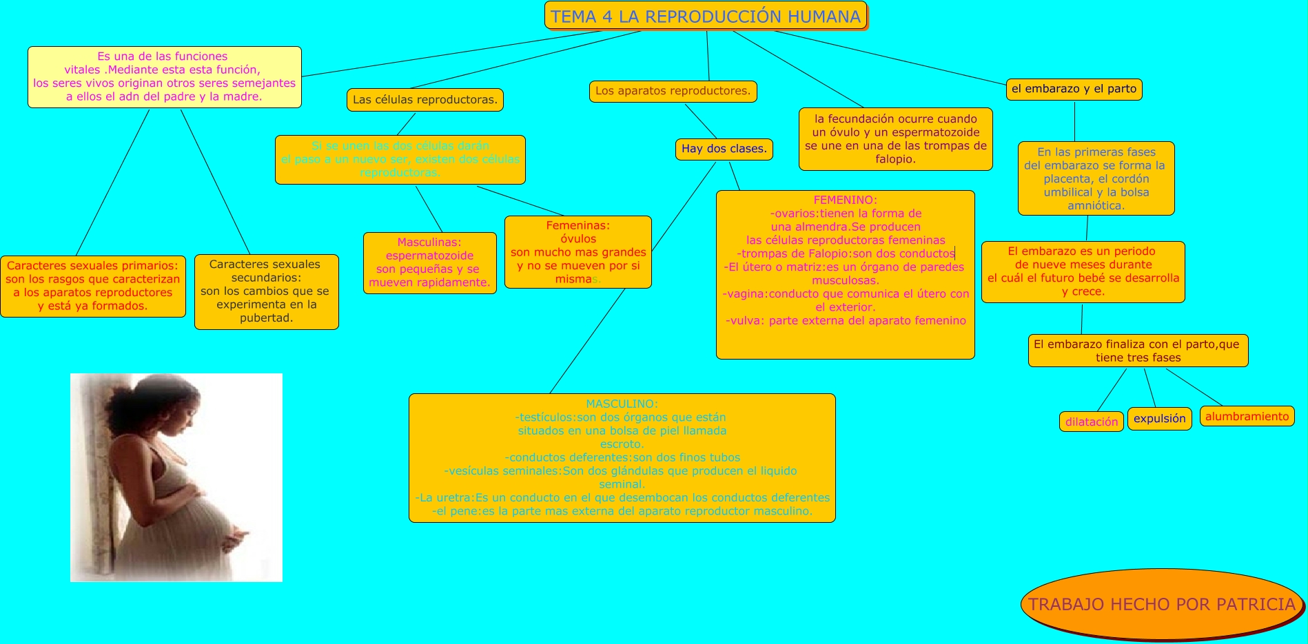 Este Cmap, tiene información relacionada con: Patricia- La reproducción humana (Tema 4), TEMA 4 LA REPRODUCCIÓN HUMANA ???? Los aparatos reproductores., El embarazo finaliza con el parto,que tiene tres fases ???? alumbramiento, Si se unen las dos células darán el paso a un nuevo ser, existen dos células reproductoras. conductos deferentes. Masculinas: espermatozoide son pequeñas y se mueven rapidamente., Las células reproductoras. ???? Si se unen las dos células darán el paso a un nuevo ser, existen dos células reproductoras., Si se unen las dos células darán el paso a un nuevo ser, existen dos células reproductoras. ???? Femeninas: óvulos son mucho mas grandes y no se mueven por si mismas., Es una de las funciones vitales .Mediante esta esta función, los seres vivos originan otros seres semejantes a ellos el adn del padre y la madre. ???? Caracteres sexuales primarios: son los rasgos que caracterizan a los aparatos reproductores y está ya formados., Hay dos clases. ???? FEMENINO: -ovarios:tienen la forma de una almendra.Se producen las células reproductoras femeninas -trompas de Falopio:son dos conductos -El útero o matriz:es un órgano de paredes musculosas. -vagina:conducto que comunica el útero con el exterior. -vulva: parte externa del aparato femenino, TEMA 4 LA REPRODUCCIÓN HUMANA ???? Las células reproductoras., TEMA 4 LA REPRODUCCIÓN HUMANA ???? la fecundación ocurre cuando un óvulo y un espermatozoide se une en una de las trompas de falopio., El embarazo finaliza con el parto,que tiene tres fases ???? dilatación, El embarazo es un periodo de nueve meses durante el cuál el futuro bebé se desarrolla y crece. ???? El embarazo finaliza con el parto,que tiene tres fases, Los aparatos reproductores. ???? Hay dos clases., el embarazo y el parto ???? En las primeras fases del embarazo se forma la placenta, el cordón umbilical y la bolsa amniótica., TEMA 4 LA REPRODUCCIÓN HUMANA ???? el embarazo y el parto, Es una de las funciones vitales .Mediante esta esta función, los seres vivos originan otros seres semejantes a ellos el adn del padre y la madre. ???? Caracteres sexuales secundarios: son los cambios que se experimenta en la pubertad., TEMA 4 LA REPRODUCCIÓN HUMANA ???? Es una de las funciones vitales .Mediante esta esta función, los seres vivos originan otros seres semejantes a ellos el adn del padre y la madre., El embarazo finaliza con el parto,que tiene tres fases ???? expulsión, Hay dos clases. ???? MASCULINO: -testículos:son dos órganos que están situados en una bolsa de piel llamada escroto. -conductos deferentes:son dos finos tubos -vesículas seminales:Son dos glándulas que producen el liquido seminal. -La uretra:Es un conducto en el que desembocan los conductos deferentes -el pene:es la parte mas externa del aparato reproductor masculino., En las primeras fases del embarazo se forma la placenta, el cordón umbilical y la bolsa amniótica. ???? El embarazo es un periodo de nueve meses durante el cuál el futuro bebé se desarrolla y crece.