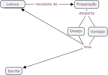 Esse mapa conceitual, produzido no IHMC CmapTools, tem a informação relacionada a: Leitura, Preparação desperta Vontade, Desejo leva Escrita, Leitura necessita de Preparação, Preparação desperta Desejo, Vontade leva Leitura, Desejo leva Leitura, Vontade leva Escrita