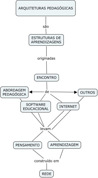 Esse mapa conceitual, produzido no IHMC CmapTools, tem a informação relacionada a: Arquitetura Pedagógica, ARQUITETURAS PEDAGÓGICAS são ESTRUTURAS DE APRENDIZAGENS, ENCONTRO de SOFTWARE EDUCACIONAL, ABORDAGEM PEDAGÓGICA levam APRENDIZAGEM, OUTROS levam PENSAMENTO, ENCONTRO de ABORDAGEM PEDAGÓGICA, INTERNET levam PENSAMENTO, SOFTWARE EDUCACIONAL levam APRENDIZAGEM, ENCONTRO de OUTROS, APRENDIZAGEM construído em REDE, OUTROS levam APRENDIZAGEM, ESTRUTURAS DE APRENDIZAGENS originadas ENCONTRO, PENSAMENTO construído em REDE, SOFTWARE EDUCACIONAL levam PENSAMENTO, INTERNET levam APRENDIZAGEM, ENCONTRO de INTERNET, ABORDAGEM PEDAGÓGICA levam PENSAMENTO