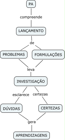 Esse mapa conceitual, produzido no IHMC CmapTools, tem a informação relacionada a: Projetos Aprendizagem, FORMULAÇÔES leva INVESTIGAÇÂO, LANÇAMENTO de PROBLEMAS, INVESTIGAÇÂO esclarece DÚVIDAS, INVESTIGAÇÂO certezas CERTEZAS, PROBLEMAS leva INVESTIGAÇÂO, CERTEZAS gera APRENDIZAGENS, PA compreende LANÇAMENTO, DÚVIDAS gera APRENDIZAGENS, LANÇAMENTO de FORMULAÇÔES