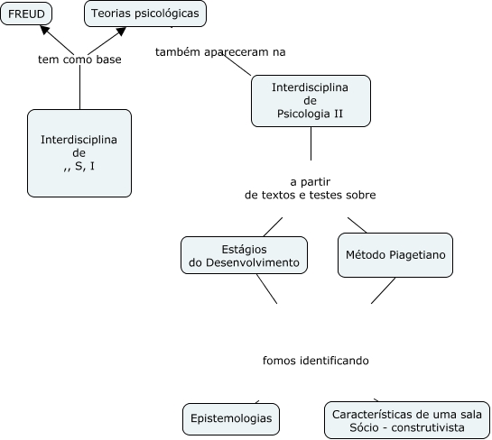 Este Cmap, tiene información relacionada con: Int.Psicologia, Método Piagetiano fomos identificando Características de uma sala Sócio - construtivista, Estágios do Desenvolvimento fomos identificando Características de uma sala Sócio - construtivista, Interdisciplina de ,, S, I tem como base FREUD, Interdisciplina de Psicologia II a partir de textos e testes sobre Método Piagetiano, Interdisciplina de ,, S, I tem como base Teorias psicológicas, Teorias psicológicas também apareceram na Interdisciplina de Psicologia II, Estágios do Desenvolvimento fomos identificando Epistemologias, Método Piagetiano fomos identificando Epistemologias, Interdisciplina de Psicologia II a partir de textos e testes sobre Estágios do Desenvolvimento
