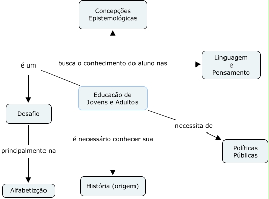 Esse mapa conceitual, produzido no IHMC CmapTools, tem a informação relacionada a: EJA, Educação de Jovens e Adultos é um Desafio, Educação de Jovens e Adultos é necessário conhecer sua História (origem), Educação de Jovens e Adultos busca o conhecimento do aluno nas Concepções Epistemológicas, Educação de Jovens e Adultos necessita de Políticas Públicas, Desafio principalmente na Alfabetizção, Educação de Jovens e Adultos busca o conhecimento do aluno nas Linguagem e Pensamento