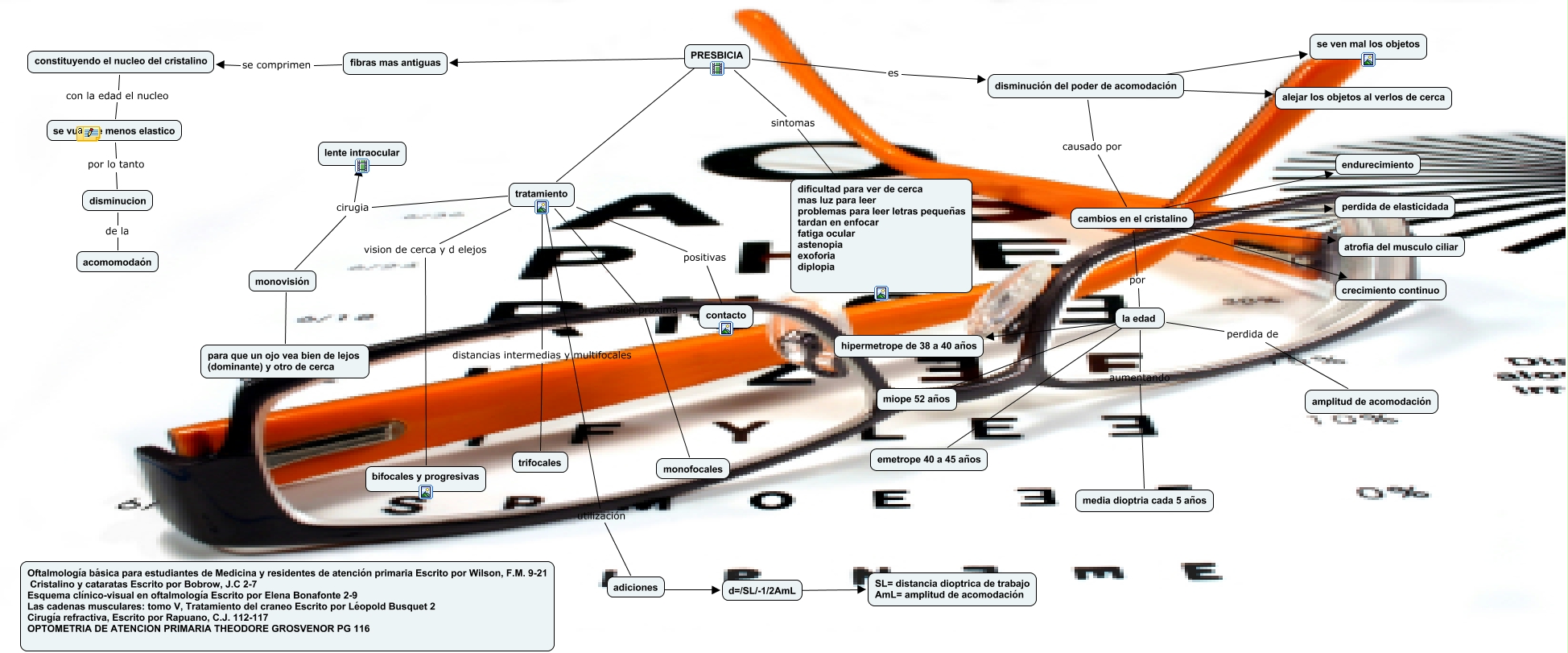 Este Cmap, tiene información relacionada con: PLIEGOLOPEZILSEKARINA-3TM1-PRESBICIA, d=/SL/-1/2AmL ???? SL= distancia dioptrica de trabajo AmL= amplitud de acomodación, la edad perdida de amplitud de acomodación, tratamiento utilización adiciones, constituyendo el nucleo del cristalino con la edad el nucleo se vuloeve menos elastico, tratamiento cirugia monovisión, tratamiento cirugia lente intraocular, PRESBICIA es disminución del poder de acomodación, disminucion de la acomomodaón, cambios en el cristalino ???? atrofia del musculo ciliar, la edad ???? miope 52 años, monovisión ???? para que un ojo vea bien de lejos (dominante) y otro de cerca, disminución del poder de acomodación causado por cambios en el cristalino, la edad ???? hipermetrope de 38 a 40 años, disminución del poder de acomodación ???? se ven mal los objetos, fibras mas antiguas se comprimen constituyendo el nucleo del cristalino, la edad aumentando media dioptria cada 5 años, cambios en el cristalino ???? endurecimiento, se vuloeve menos elastico por lo tanto disminucion, PRESBICIA sintomas dificultad para ver de cerca mas luz para leer problemas para leer letras pequeñas tardan en enfocar fatiga ocular astenopia exoforia diplopia, tratamiento distancias intermedias y multifocales trifocales