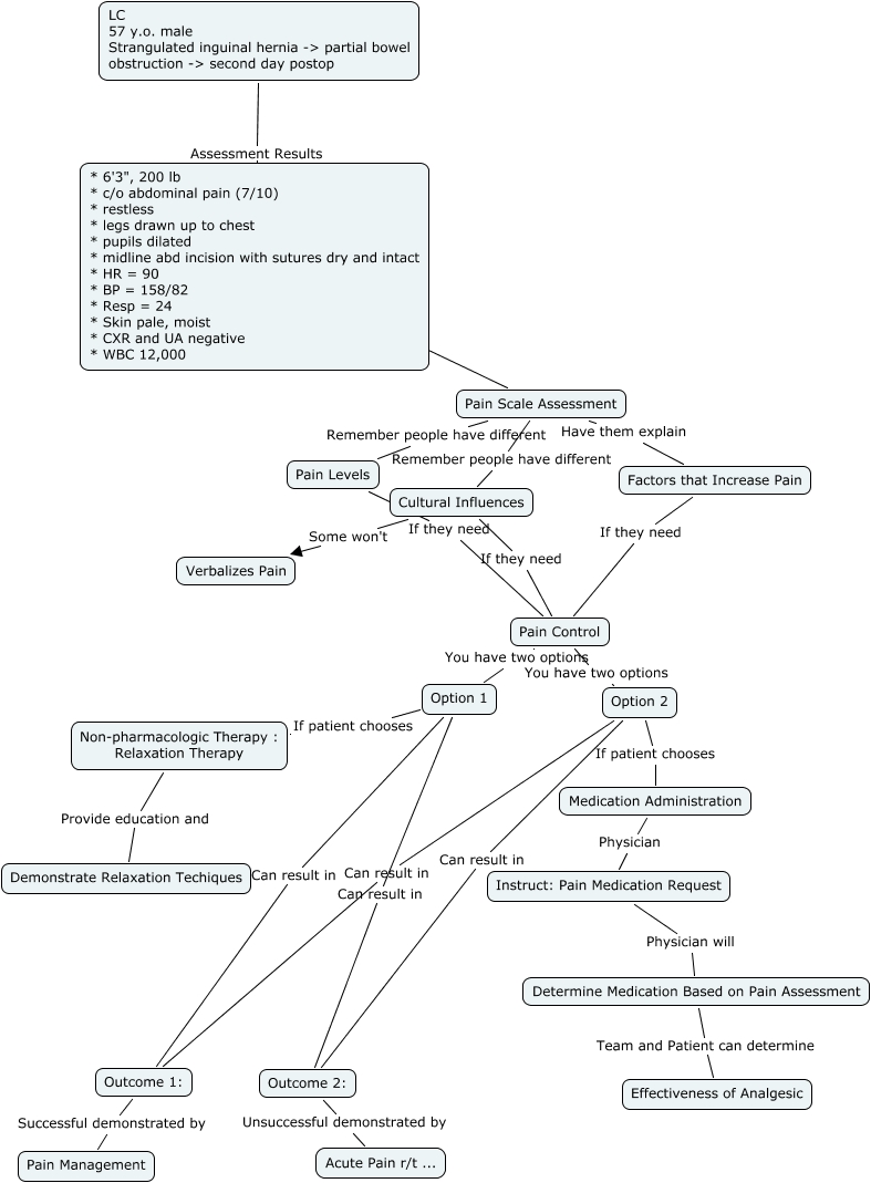 This Concept Map, created with IHMC CmapTools, has information related to: Adams,J, Medication Administration Physician Instruct: Pain Medication Request, LC 57 y.o. male Strangulated inguinal hernia -> partial bowel obstruction -> second day postop Assessment Results * 6'3", 200 lb * c/o abdominal pain (7/10) * restless * legs drawn up to chest * pupils dilated * midline abd incision with sutures dry and intact * HR = 90 * BP = 158/82 * Resp = 24 * Skin pale, moist * CXR and UA negative * WBC 12,000, Outcome 2: Unsuccessful demonstrated by Acute Pain r/t ..., Option 1 Can result in Outcome 2:, Outcome 1: Successful demonstrated by Pain Management, Non-pharmacologic Therapy : Relaxation Therapy Provide education and Demonstrate Relaxation Techiques, Option 1 Can result in Outcome 1:, Option 1 If patient chooses Non-pharmacologic Therapy : Relaxation Therapy, Pain Scale Assessment Remember people have different Cultural Influences, Instruct: Pain Medication Request Physician will Determine Medication Based on Pain Assessment, Pain Scale Assessment Have them explain Factors that Increase Pain, Cultural Influences If they need Pain Control, Factors that Increase Pain If they need Pain Control, Option 2 Can result in Outcome 2:, Cultural Influences Some won't Verbalizes Pain, Pain Control You have two options Option 1, Pain Control You have two options Option 2, Pain Scale Assessment Remember people have different Pain Levels, Option 2 If patient chooses Medication Administration, * 6'3", 200 lb * c/o abdominal pain (7/10) * restless * legs drawn up to chest * pupils dilated * midline abd incision with sutures dry and intact * HR = 90 * BP = 158/82 * Resp = 24 * Skin pale, moist * CXR and UA negative * WBC 12,000 Fru Pain Scale Assessment