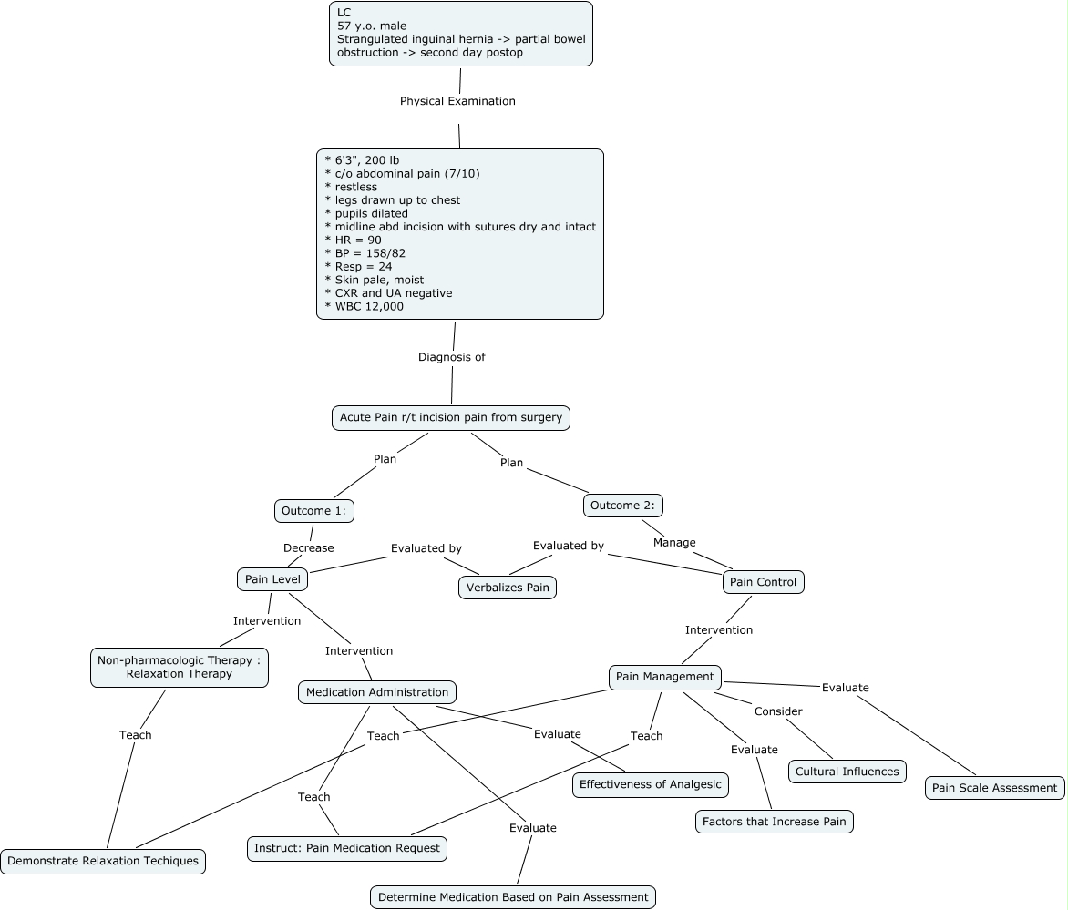 This Concept Map, created with IHMC CmapTools, has information related to: Acute Pain Concept Map - Nguyen, S.cmap, Pain Management Teach Demonstrate Relaxation Techiques, Medication Administration Evaluate Determine Medication Based on Pain Assessment, Acute Pain r/t incision pain from surgery Plan Outcome 2:, Outcome 2: Manage Pain Control, Pain Control Evaluated by Verbalizes Pain, Pain Management Evaluate Factors that Increase Pain, Pain Management Teach Instruct: Pain Medication Request, Pain Management Consider Cultural Influences, Medication Administration Evaluate Effectiveness of Analgesic, LC 57 y.o. male Strangulated inguinal hernia -> partial bowel obstruction -> second day postop Physical Examination * 6'3", 200 lb * c/o abdominal pain (7/10) * restless * legs drawn up to chest * pupils dilated * midline abd incision with sutures dry and intact * HR = 90 * BP = 158/82 * Resp = 24 * Skin pale, moist * CXR and UA negative * WBC 12,000, Pain Level Evaluated by Verbalizes Pain, Medication Administration Teach Instruct: Pain Medication Request, Pain Level Intervention Non-pharmacologic Therapy : Relaxation Therapy, Pain Management Evaluate Pain Scale Assessment, Outcome 1: Decrease Pain Level, Non-pharmacologic Therapy : Relaxation Therapy Teach Demonstrate Relaxation Techiques, Acute Pain r/t incision pain from surgery Plan Outcome 1:, * 6'3", 200 lb * c/o abdominal pain (7/10) * restless * legs drawn up to chest * pupils dilated * midline abd incision with sutures dry and intact * HR = 90 * BP = 158/82 * Resp = 24 * Skin pale, moist * CXR and UA negative * WBC 12,000 Diagnosis of Acute Pain r/t incision pain from surgery, Pain Level Intervention Medication Administration, Pain Control Intervention Pain Management