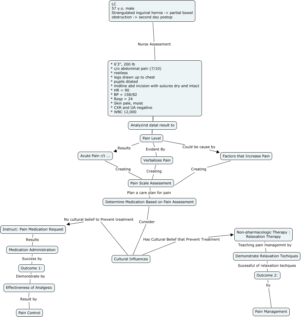 This Concept Map, created with IHMC CmapTools, has information related to: AcutePain - Mai.cmap, Non-pharmacologic Therapy : Relaxation Therapy Teaching pain managemnt by Demonstrate Relaxation Techiques, Pain Scale Assessment Plan a care plan for pain Determine Medication Based on Pain Assessment, * 6'3", 200 lb * c/o abdominal pain (7/10) * restless * legs drawn up to chest * pupils dilated * midline abd incision with sutures dry and intact * HR = 90 * BP = 158/82 * Resp = 24 * Skin pale, moist * CXR and UA negative * WBC 12,000 An Pain Level, Outcome 2: by Pain Management, Acute Pain r/t ... Creating Pain Scale Assessment, * 6'3", 200 lb * c/o abdominal pain (7/10) * restless * legs drawn up to chest * pupils dilated * midline abd incision with sutures dry and intact * HR = 90 * BP = 158/82 * Resp = 24 * Skin pale, moist * CXR and UA negative * WBC 12,000 ???? Pain Level, Medication Administration Success by Outcome 1:, Pain Level Could be cause by Factors that Increase Pain, Pain Level Evident By Verbalizes Pain, * 6'3", 200 lb * c/o abdominal pain (7/10) * restless * legs drawn up to chest * pupils dilated * midline abd incision with sutures dry and intact * HR = 90 * BP = 158/82 * Resp = 24 * Skin pale, moist * CXR and UA negative * WBC 12,000 ???? Analyzind datal result to, Demonstrate Relaxation Techiques Sucessful of relaxation techques Outcome 2:, Cultural Influences Has Cultural Belief that Prevent Treatment Non-pharmacologic Therapy : Relaxation Therapy, Determine Medication Based on Pain Assessment Consider Cultural Influences, Instruct: Pain Medication Request Results Medication Administration, Effectiveness of Analgesic Result by Pain Control, Verbalizes Pain Creating Pain Scale Assessment, Cultural Influences No cultural belief to Prevent treatment Instruct: Pain Medication Request, LC 57 y.o. male Strangulated inguinal hernia -> partial bowel obstruction -> second day postop Nurse Assessment * 6'3", 200 lb * c/o abdominal pain (7/10) * restless * legs drawn up to chest * pupils dilated * midline abd incision with sutures dry and intact * HR = 90 * BP = 158/82 * Resp = 24 * Skin pale, moist * CXR and UA negative * WBC 12,000, Pain Level Results Acute Pain r/t ..., Outcome 1: Demonstrate by Effectiveness of Analgesic