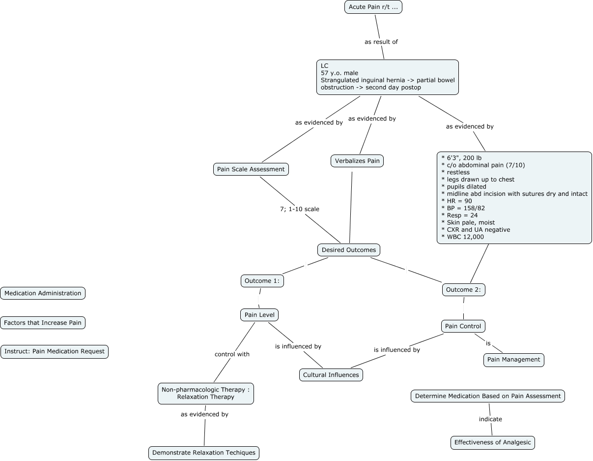 This Concept Map, created with IHMC CmapTools, has information related to: AcutePainFigueroa, * 6'3", 200 lb * c/o abdominal pain (7/10) * restless * legs drawn up to chest * pupils dilated * midline abd incision with sutures dry and intact * HR = 90 * BP = 158/82 * Resp = 24 * Skin pale, moist * CXR and UA negative * WBC 12,000 ???? Outcome 2:, Acute Pain r/t ... as result of LC 57 y.o. male Strangulated inguinal hernia -> partial bowel obstruction -> second day postop, LC 57 y.o. male Strangulated inguinal hernia -> partial bowel obstruction -> second day postop as evidenced by * 6'3", 200 lb * c/o abdominal pain (7/10) * restless * legs drawn up to chest * pupils dilated * midline abd incision with sutures dry and intact * HR = 90 * BP = 158/82 * Resp = 24 * Skin pale, moist * CXR and UA negative * WBC 12,000, Desired Outcomes Outcome 2:, Outcome 2: Pain Control, Pain Level control with Non-pharmacologic Therapy : Relaxation Therapy, Pain Control is influenced by Cultural Influences, Outcome 1: Pain Level, Verbalizes Pain Desired Outcomes, LC 57 y.o. male Strangulated inguinal hernia -> partial bowel obstruction -> second day postop as evidenced by Verbalizes Pain, Non-pharmacologic Therapy : Relaxation Therapy as evidenced by Demonstrate Relaxation Techiques, Determine Medication Based on Pain Assessment indicate Effectiveness of Analgesic, Pain Scale Assessment 7; 1-10 scale Desired Outcomes, Pain Level is influenced by Cultural Influences, LC 57 y.o. male Strangulated inguinal hernia -> partial bowel obstruction -> second day postop as evidenced by Pain Scale Assessment, Pain Control is Pain Management, Desired Outcomes Outcome 1: