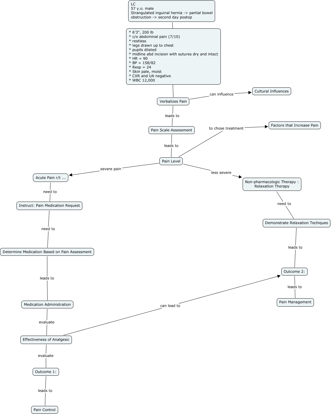 This Concept Map, created with IHMC CmapTools, has information related to: AcutePain - Parking Lot, Determine Medication Based on Pain Assessment leads to Medication Administration, Acute Pain r/t ... need to Instruct: Pain Medication Request, LC 57 y.o. male Strangulated inguinal hernia -> partial bowel obstruction -> second day postop ???? * 6'3", 200 lb * c/o abdominal pain (7/10) * restless * legs drawn up to chest * pupils dilated * midline abd incision with sutures dry and intact * HR = 90 * BP = 158/82 * Resp = 24 * Skin pale, moist * CXR and UA negative * WBC 12,000, Outcome 1: leads to Pain Control, Effectiveness of Analgesic evaluate Outcome 1:, Medication Administration evaluate Effectiveness of Analgesic, Verbalizes Pain leads to Pain Scale Assessment, Pain Scale Assessment leads to Pain Level, Verbalizes Pain can influence Cultural Influences, * 6'3", 200 lb * c/o abdominal pain (7/10) * restless * legs drawn up to chest * pupils dilated * midline abd incision with sutures dry and intact * HR = 90 * BP = 158/82 * Resp = 24 * Skin pale, moist * CXR and UA negative * WBC 12,000 ???? Verbalizes Pain, Non-pharmacologic Therapy : Relaxation Therapy need to Demonstrate Relaxation Techiques, Instruct: Pain Medication Request need to Determine Medication Based on Pain Assessment, Pain Level to chose treatment Factors that Increase Pain, Pain Level less severe Non-pharmacologic Therapy : Relaxation Therapy, Effectiveness of Analgesic can lead to Outcome 2:, Pain Level severe pain Acute Pain r/t ..., Demonstrate Relaxation Techiques leads to Outcome 2:, Outcome 2: leads to Pain Management