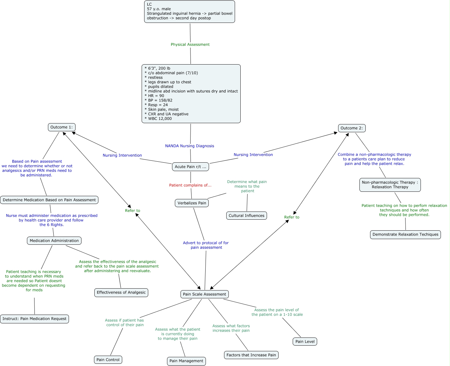 This Concept Map, created with IHMC CmapTools, has information related to: AcutePain - Hermano, Lawrence.cmap, Pain Scale Assessment Assess the pain level of the patient on a 1-10 scale Pain Level, LC 57 y.o. male Strangulated inguinal hernia -> partial bowel obstruction -> second day postop Physical Assessment * 6'3", 200 lb * c/o abdominal pain (7/10) * restless * legs drawn up to chest * pupils dilated * midline abd incision with sutures dry and intact * HR = 90 * BP = 158/82 * Resp = 24 * Skin pale, moist * CXR and UA negative * WBC 12,000, Non-pharmacologic Therapy : Relaxation Therapy Patient teaching on how to perfom relaxation techniques and how often they should be performed. Demonstrate Relaxation Techiques, * 6'3", 200 lb * c/o abdominal pain (7/10) * restless * legs drawn up to chest * pupils dilated * midline abd incision with sutures dry and intact * HR = 90 * BP = 158/82 * Resp = 24 * Skin pale, moist * CXR and UA negative * WBC 12,000 NANDA Nursing Diagnosis Acute Pain r/t ..., Acute Pain r/t ... Nursing Intervention Outcome 2:, Outcome 2: Combine a non-pharmacologic therapy to a patients care plan to reduce pain and help the patient relax. Non-pharmacologic Therapy : Relaxation Therapy, Medication Administration Assess the effectiveness of the analgesic and refer back to the pain scale assessment after administering and reevaluate. Effectiveness of Analgesic, Outcome 1: Based on Pain assessment we need to determine whether or not analgesics and/or PRN meds need to be administered. Determine Medication Based on Pain Assessment, Pain Scale Assessment Refer to Outcome 1:, Medication Administration Patient teaching is necessary to understand when PRN meds are needed so Patient doesnt become dependent on requesting for meds Instruct: Pain Medication Request, Pain Scale Assessment Refer to Outcome 2:, Determine Medication Based on Pain Assessment Nurse must administer medication as prescribed by health care provider and follow the 6 Rights. Medication Administration, Acute Pain r/t ... Nursing Intervention Outcome 1:, Verbalizes Pain Advert to protocal of for pain assessment Pain Scale Assessment, Pain Scale Assessment Assess what factors increases their pain Factors that Increase Pain, Verbalizes Pain Determine what pain means to the patient Cultural Influences, Acute Pain r/t ... Patient complains of... Verbalizes Pain, Pain Scale Assessment Assess if patient has control of their pain Pain Control, Pain Scale Assessment Assess what the patient is currently doing to manage their pain Pain Management
