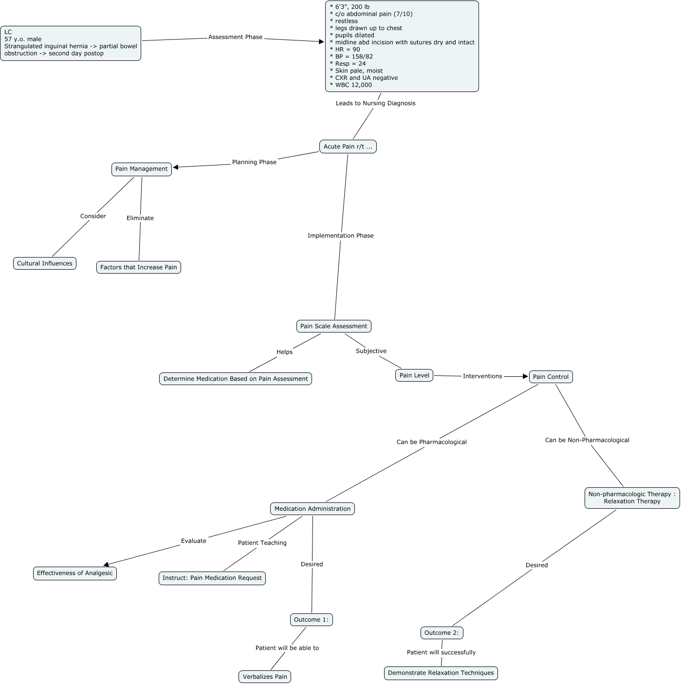 This Concept Map, created with IHMC CmapTools, has information related to: AcutePain Lew - Parking Lot.cmap, Pain Scale Assessment Helps Determine Medication Based on Pain Assessment, Outcome 1: Patient will be able to Verbalizes Pain, Pain Control Can be Non-Pharmacological Non-pharmacologic Therapy : Relaxation Therapy, LC 57 y.o. male Strangulated inguinal hernia -> partial bowel obstruction -> second day postop Assessment Phase * 6'3", 200 lb * c/o abdominal pain (7/10) * restless * legs drawn up to chest * pupils dilated * midline abd incision with sutures dry and intact * HR = 90 * BP = 158/82 * Resp = 24 * Skin pale, moist * CXR and UA negative * WBC 12,000, * 6'3", 200 lb * c/o abdominal pain (7/10) * restless * legs drawn up to chest * pupils dilated * midline abd incision with sutures dry and intact * HR = 90 * BP = 158/82 * Resp = 24 * Skin pale, moist * CXR and UA negative * WBC 12,000 Leads to Nursing Diagnosis Acute Pain r/t ..., Pain Level Interventions Pain Control, Medication Administration Desired Outcome 1:, Pain Management Eliminate Factors that Increase Pain, Medication Administration Evaluate Effectiveness of Analgesic, Acute Pain r/t ... Implementation Phase Pain Scale Assessment, Medication Administration Patient Teaching Instruct: Pain Medication Request, Non-pharmacologic Therapy : Relaxation Therapy Desired Outcome 2:, Pain Scale Assessment Subjective Pain Level, Pain Management Consider Cultural Influences, Outcome 2: Patient will successfully Demonstrate Relaxation Techniques, Acute Pain r/t ... Planning Phase Pain Management, Pain Control Can be Pharmacological Medication Administration