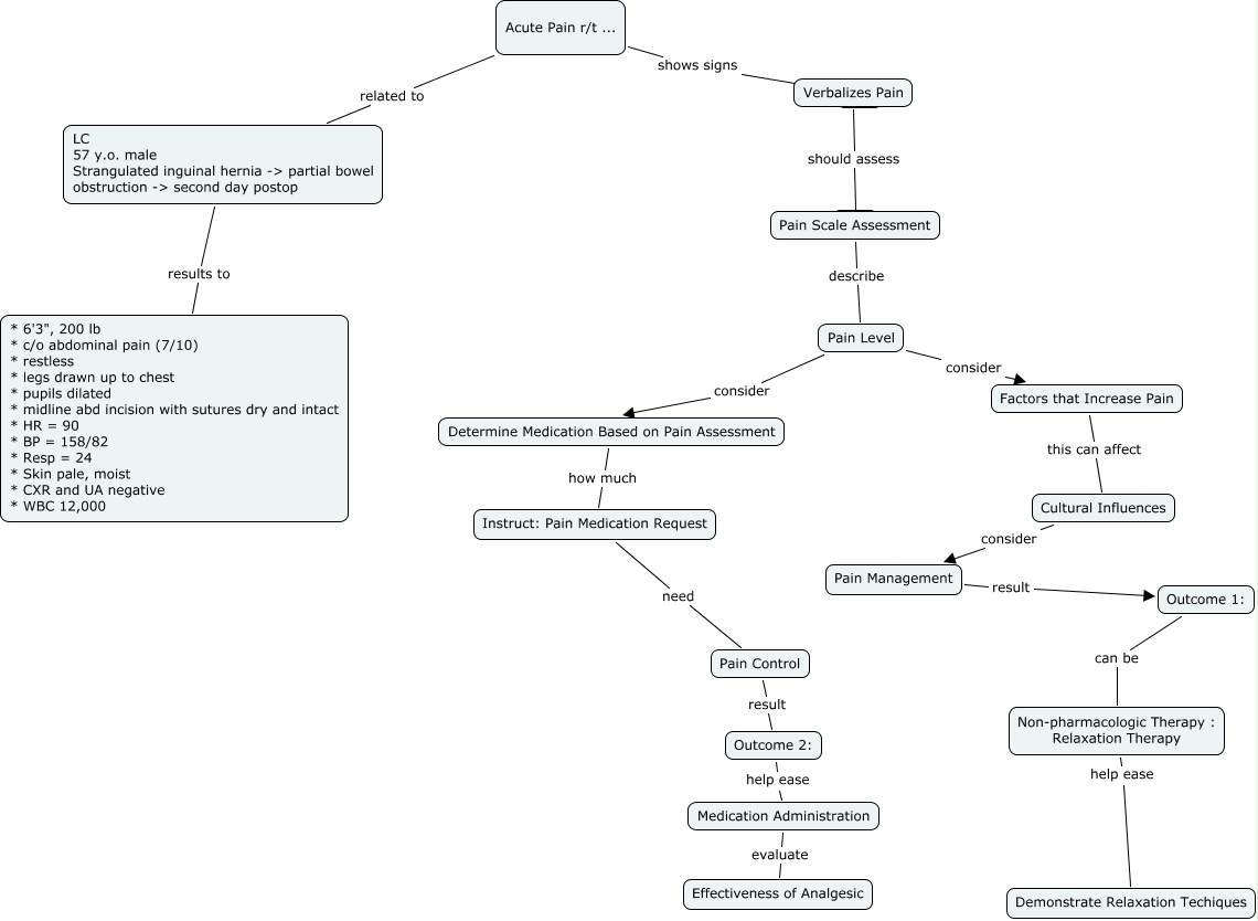 This Concept Map, created with IHMC CmapTools, has information related to: AcutePain - Parking Lot 1, Outcome 2: help ease Medication Administration, Pain Management result Outcome 1:, Acute Pain r/t ... related to LC 57 y.o. male Strangulated inguinal hernia -> partial bowel obstruction -> second day postop, Pain Control result Outcome 2:, Outcome 1: can be Non-pharmacologic Therapy : Relaxation Therapy, Medication Administration evaluate Effectiveness of Analgesic, Instruct: Pain Medication Request need Pain Control, Non-pharmacologic Therapy : Relaxation Therapy help ease Demonstrate Relaxation Techiques, Verbalizes Pain should assess Pain Scale Assessment, Acute Pain r/t ... shows signs ????, Determine Medication Based on Pain Assessment how much Instruct: Pain Medication Request, Factors that Increase Pain this can affect Cultural Influences, Pain Level consider Factors that Increase Pain, LC 57 y.o. male Strangulated inguinal hernia -> partial bowel obstruction -> second day postop results to * 6'3", 200 lb * c/o abdominal pain (7/10) * restless * legs drawn up to chest * pupils dilated * midline abd incision with sutures dry and intact * HR = 90 * BP = 158/82 * Resp = 24 * Skin pale, moist * CXR and UA negative * WBC 12,000, Pain Level consider Determine Medication Based on Pain Assessment, Cultural Influences consider Pain Management, Pain Scale Assessment describe Pain Level