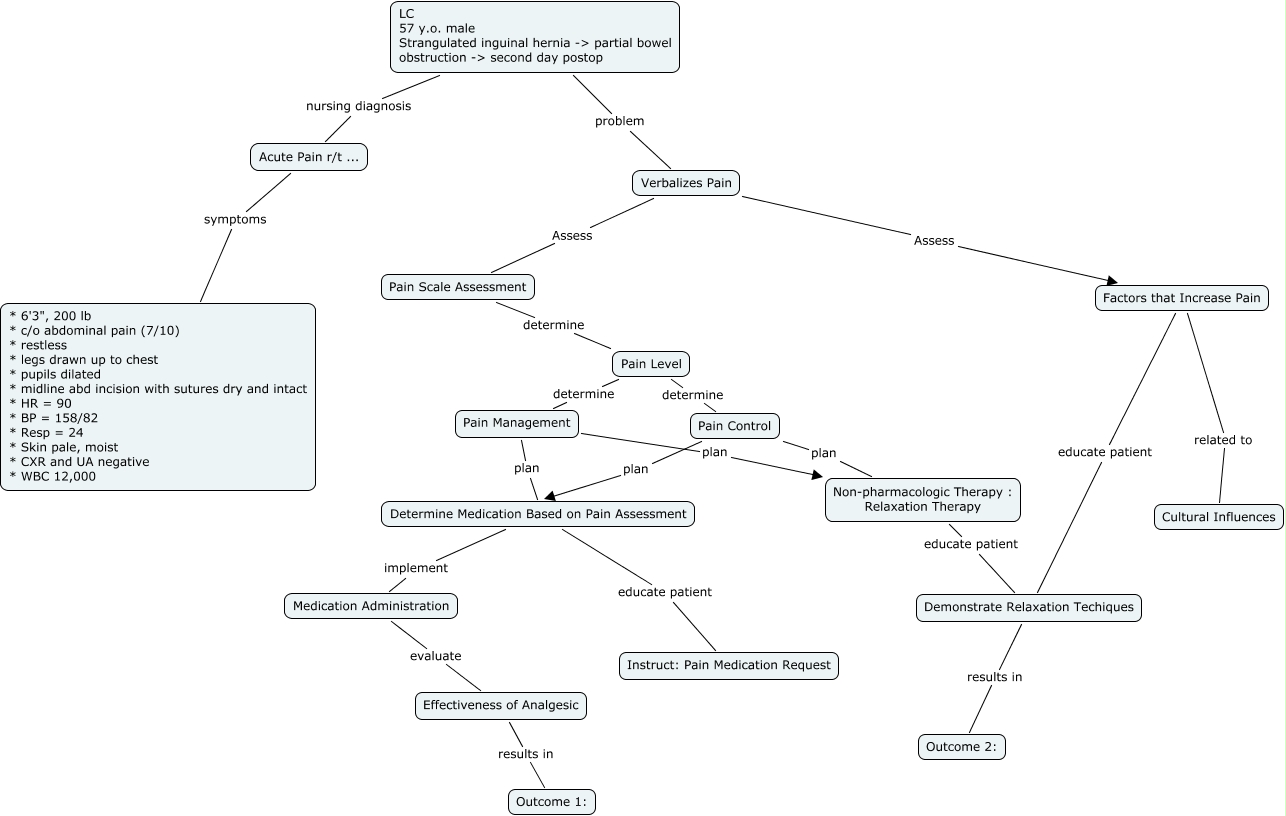 This Concept Map, created with IHMC CmapTools, has information related to: acute pain C. Vansickle, Pain Level determine Pain Management, Pain Management plan Determine Medication Based on Pain Assessment, Factors that Increase Pain related to Cultural Influences, Acute Pain r/t ... symptoms * 6'3", 200 lb * c/o abdominal pain (7/10) * restless * legs drawn up to chest * pupils dilated * midline abd incision with sutures dry and intact * HR = 90 * BP = 158/82 * Resp = 24 * Skin pale, moist * CXR and UA negative * WBC 12,000, Pain Level determine Pain Control, Verbalizes Pain Assess Pain Scale Assessment, Pain Control plan Determine Medication Based on Pain Assessment, Verbalizes Pain Assess Factors that Increase Pain, Determine Medication Based on Pain Assessment educate patient Instruct: Pain Medication Request, Medication Administration evaluate Effectiveness of Analgesic, LC 57 y.o. male Strangulated inguinal hernia -> partial bowel obstruction -> second day postop nursing diagnosis Acute Pain r/t ..., LC 57 y.o. male Strangulated inguinal hernia -> partial bowel obstruction -> second day postop problem Verbalizes Pain, Factors that Increase Pain educate patient Demonstrate Relaxation Techiques, Effectiveness of Analgesic results in Outcome 1:, Demonstrate Relaxation Techiques results in Outcome 2:, Pain Control plan Non-pharmacologic Therapy : Relaxation Therapy, Determine Medication Based on Pain Assessment implement Medication Administration, Pain Management plan Non-pharmacologic Therapy : Relaxation Therapy, Pain Scale Assessment determine Pain Level, Non-pharmacologic Therapy : Relaxation Therapy educate patient Demonstrate Relaxation Techiques