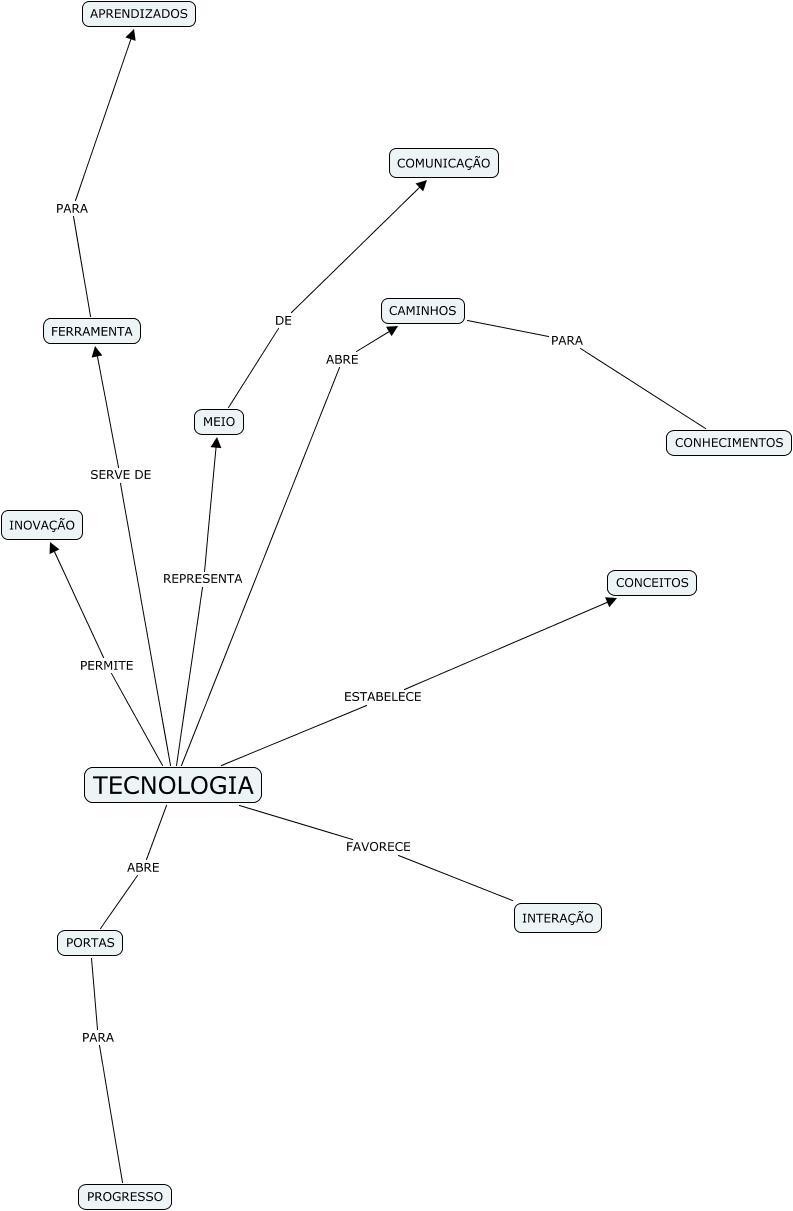 Esse mapa conceitual, produzido no IHMC CmapTools, tem a informação relacionada a: TECNOLOGIA, MEIO DE COMUNICAÇÃO, CAMINHOS PARA CONHECIMENTOS, TECNOLOGIA ABRE PORTAS, TECNOLOGIA PERMITE INOVAÇÃO, FERRAMENTA PARA APRENDIZADOS, TECNOLOGIA ESTABELECE CONCEITOS, TECNOLOGIA ABRE CAMINHOS, PORTAS PARA PROGRESSO, TECNOLOGIA SERVE DE FERRAMENTA, TECNOLOGIA FAVORECE INTERAÇÃO, TECNOLOGIA REPRESENTA MEIO