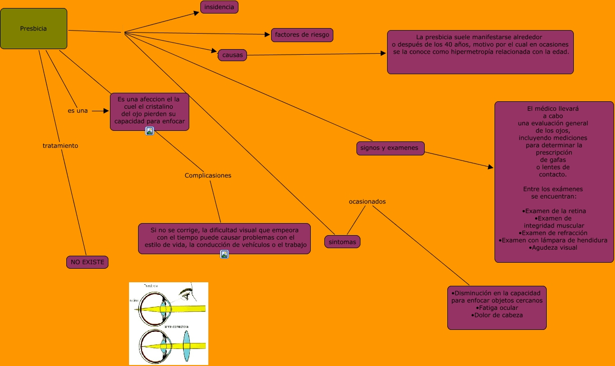 Este Cmap, tiene información relacionada con: GarciaGomezRythBerenice3tm4presbicia, Presbicia Complicasiones Si no se corrige, la dificultad visual que empeora con el tiempo puede causar problemas con el estilo de vida, la conducción de vehículos o el trabajo, Presbicia tratamiento NO EXISTE, sintomas ocasionados •Disminución en la capacidad para enfocar objetos cercanos •Fatiga ocular •Dolor de cabeza, causas ???? La presbicia suele manifestarse alrededor o después de los 40 años, motivo por el cual en ocasiones se la conoce como hipermetropía relacionada con la edad., Presbicia es una Es una afeccion el la cuel el cristalino del ojo pierden su capacidad para enfocar, Presbicia insidencia, Presbicia sintomas, Presbicia factores de riesgo, signos y examenes ???? El médico llevará a cabo una evaluación general de los ojos, incluyendo mediciones para determinar la prescripción de gafas o lentes de contacto. Entre los exámenes se encuentran: •Examen de la retina •Examen de integridad muscular •Examen de refracción •Examen con lámpara de hendidura •Agudeza visual, Presbicia causas, Presbicia signos y examenes