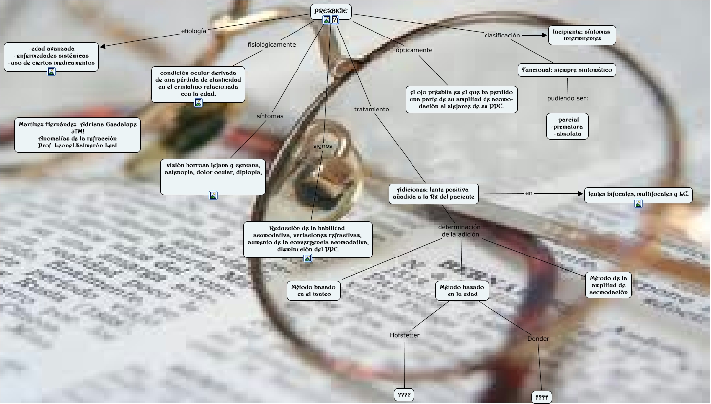 Este Cmap, tiene información relacionada con: Martinez Hernandez Adriana Guadalupe, PRESBICIE ópticamente el ojo présbita es el que ha perdido una parte de su amplitud de acomo- dación al alejarce de su PPC., Método basado en la edad Donder ????, PRESBICIE signos Reducción de la habilidad acomodativa, variaciones refractivas, aumento de la convergencia acomodativa, disminución del PPC., PRESBICIE clasificación Incipiente: síntomas intermitentes, PRESBICIE etiología -edad avanzada -enfermedades sistémicas -uso de ciertos medicamentos, PRESBICIE fisiológicamente condición ocular derivada de una pérdida de elasticidad en el cristalino relacionada con la edad., Adiciones: lente positiva añadida a la Rx del paciente determinación de la adición Método basado en el tanteo, PRESBICIE clasificación Funcional: siempre sintomático, PRESBICIE tratamiento Adiciones: lente positiva añadida a la Rx del paciente, Adiciones: lente positiva añadida a la Rx del paciente en lentes bifocales, multifocales y LC., Adiciones: lente positiva añadida a la Rx del paciente determinación de la adición Método de la amplitud de acomodación, Funcional: siempre sintomático pudiendo ser: -parcial -prematura -absoluta, PRESBICIE síntomas visión borrosa lejana y cercana, astenopia, dolor ocular, diplopia,, Método basado en la edad Hofstetter ????, Adiciones: lente positiva añadida a la Rx del paciente determinación de la adición Método basado en la edad