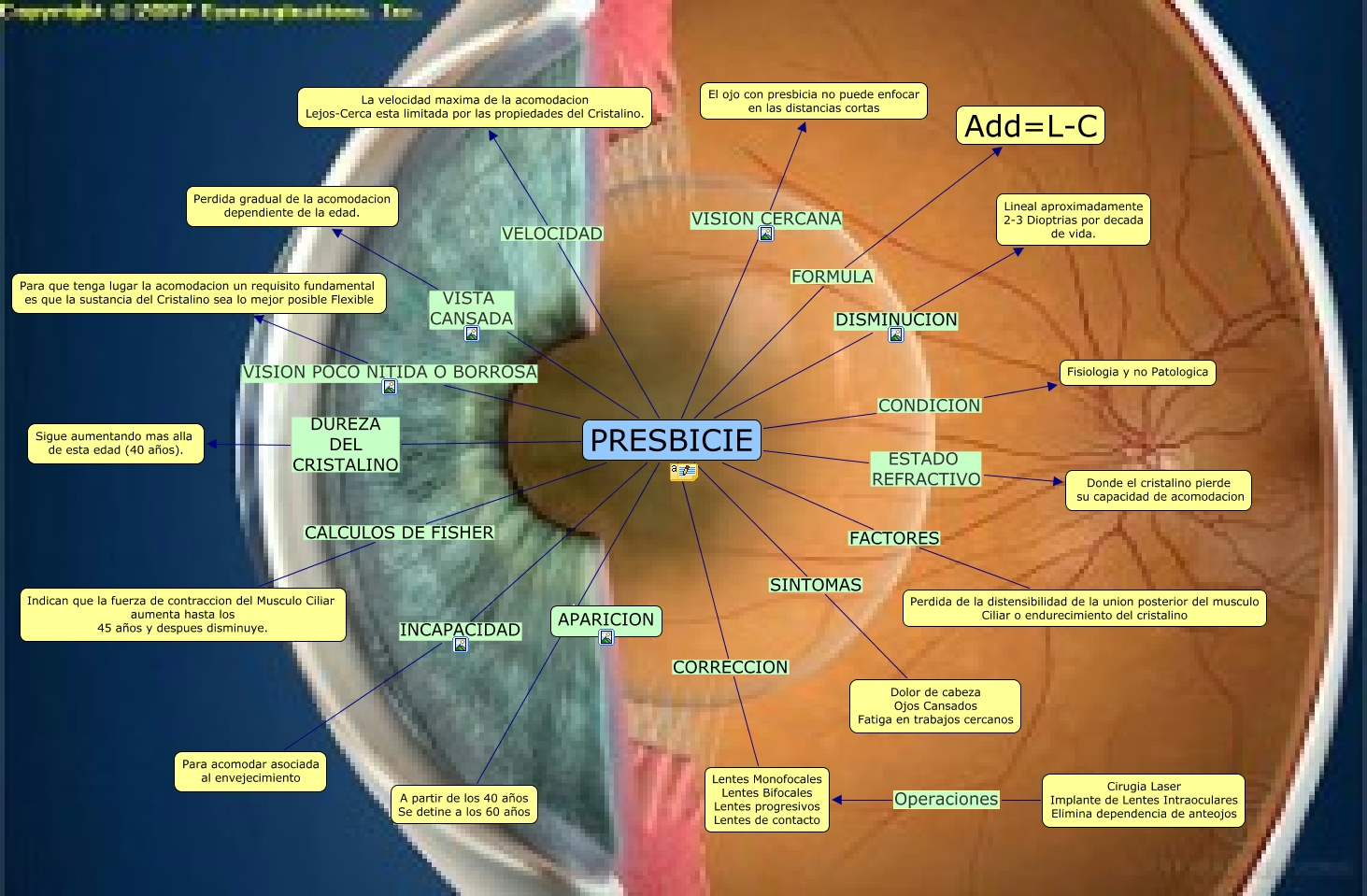 Este Cmap, tiene información relacionada con: BERENICE DE LA R.3TM1presbicie, PRESBICIE VISION CERCANA El ojo con presbicia no puede enfocar en las distancias cortas, PRESBICIE A partir de los 40 años Se detine a los 60 años, PRESBICIE CORRECCION Lentes Monofocales Lentes Bifocales Lentes progresivos Lentes de contacto, PRESBICIE FORMULA Add=L-C, PRESBICIE DUREZA DEL CRISTALINO Sigue aumentando mas alla de esta edad (40 años)., Cirugia Laser Implante de Lentes Intraoculares Elimina dependencia de anteojos Operaciones Lentes Monofocales Lentes Bifocales Lentes progresivos Lentes de contacto, PRESBICIE INCAPACIDAD Para acomodar asociada al envejecimiento, PRESBICIE VELOCIDAD La velocidad maxima de la acomodacion Lejos-Cerca esta limitada por las propiedades del Cristalino., PRESBICIE SINTOMAS Dolor de cabeza Ojos Cansados Fatiga en trabajos cercanos, PRESBICIE DISMINUCION Lineal aproximadamente 2-3 Dioptrias por decada de vida., PRESBICIE VISTA CANSADA Perdida gradual de la acomodacion dependiente de la edad., PRESBICIE CALCULOS DE FISHER Indican que la fuerza de contraccion del Musculo Ciliar aumenta hasta los 45 años y despues disminuye., PRESBICIE ESTADO REFRACTIVO Donde el cristalino pierde su capacidad de acomodacion, PRESBICIE VISION POCO NITIDA O BORROSA Para que tenga lugar la acomodacion un requisito fundamental es que la sustancia del Cristalino sea lo mejor posible Flexible, PRESBICIE FACTORES Perdida de la distensibilidad de la union posterior del musculo Ciliar o endurecimiento del cristalino, PRESBICIE CONDICION Fisiologia y no Patologica