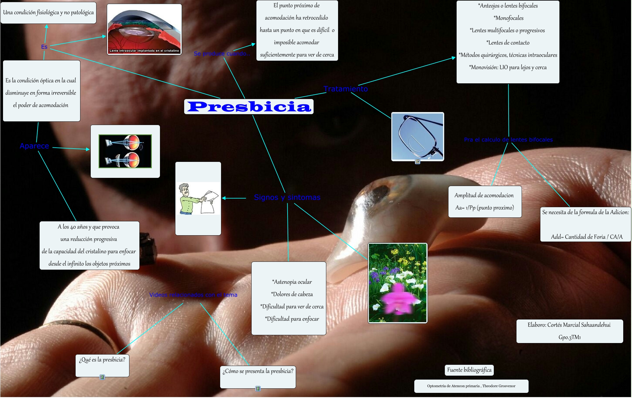 Este Cmap, tiene información relacionada con: Presbicia Cortés Marcial Sahaadehui, ¿Qué es la presbicia? Videos relacionados con el tema ¿Cómo se presenta la presbicia?, Es la condición óptica en la cual disminuye en forma irreversible el poder de acomodación Aparece A los 40 años y que provoca una reducción progresiva de la capacidad del cristalino para enfocar desde el infinito los objetos próximos, Presbicia Es Es la condición óptica en la cual disminuye en forma irreversible el poder de acomodación, *Anteojos o lentes bifocales *Monofocales *Lentes multifocales o progresivos *Lentes de contacto *Métodos quirúrgicos, técnicas intraoculares *Monovisión: LIO para lejos y cerca Pra el calculo de lentes bifocales Amplitud de acomodacion Aa= 1/Pp (punto proximo), Es la condición óptica en la cual disminuye en forma irreversible el poder de acomodación Aparece ????, Presbicia Se produce cuando.. El punto próximo de acomodación ha retrocedido hasta un punto en que es difícil o imposible acomodar suficientemente para ver de cerca, Presbicia Tratamiento, *Anteojos o lentes bifocales *Monofocales *Lentes multifocales o progresivos *Lentes de contacto *Métodos quirúrgicos, técnicas intraoculares *Monovisión: LIO para lejos y cerca Pra el calculo de lentes bifocales Se necesita de la formula de la Adicion: Add= Cantidad de Foria / CA/A, Presbicia Es Una condición fisiológica y no patológica, Presbicia Signos y sintomas *Astenopia ocular *Dolores de cabeza *Dificultad para ver de cerca *Dificultad para enfocar, Presbicia Tratamiento *Anteojos o lentes bifocales *Monofocales *Lentes multifocales o progresivos *Lentes de contacto *Métodos quirúrgicos, técnicas intraoculares *Monovisión: LIO para lejos y cerca, Presbicia Es, Presbicia Signos y sintomas, Presbicia Signos y sintomas