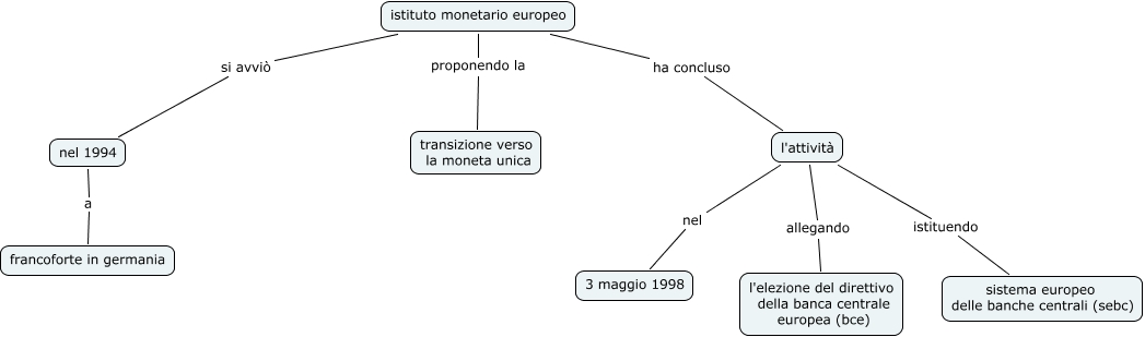 Questa Cmap, creata con IHMC CmapTools, contiene informazioni relative a: mappe recupero 4, istituto monetario europeo proponendo la transizione verso la moneta unica, istituto monetario europeo ha concluso l'attività, l'attività nel 3 maggio 1998, istituto monetario europeo si avviò nel 1994, l'attività istituendo sistema europeo delle banche centrali (sebc), nel 1994 a francoforte in germania, l'attività allegando l'elezione del direttivo della banca centrale europea (bce)