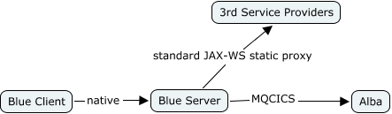 此概念图以 IHMC CmapTools 创建, 内含信息有关于: ws consumption, Blue Server MQCICS Alba, Blue Client native Blue Server, Blue Server standard JAX-WS static proxy 3rd Service Providers